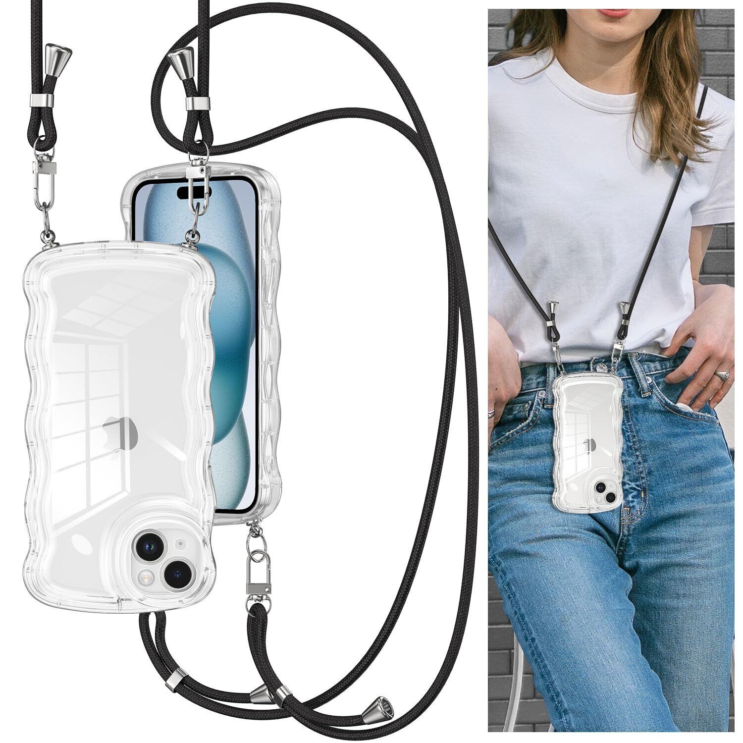 ケース iPhone 16 用ケース クリア TPUカバー 調節可能な ショルダー 肩がけ 首掛け 紐付き 斜めがけ ウェーブ おしゃれ 韓国 可愛い iPhone16用ケース アクスタ収納 透明 薄型 軽量 耐衝撃 スマホケース ワイヤレス充電対応 ストラップホール付き アイフォン16 ケース 6.1インチ 対応