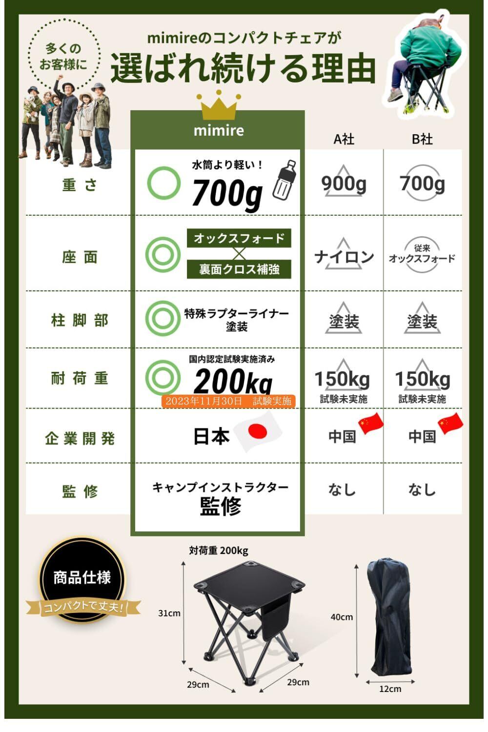 【既存商品を大幅改善!業界最高水準の耐久性】脚部のパイプはラプターライナー塗装という特殊塗装を行うことで、表面の保護をより強力に行い、耐久性・耐水性・耐光性を大幅に向上しております。また座面には610Dオックスフォード生地を採用し、撥水性・耐摩擦性・通気性を向上し、より長く安心してお使いいただけます。座面裏側にはクロスで補強を追加し、座った際に沈み込みづらく、より強靭な座面へと進化させました。この軽さとコンパクトさで国内認定試験で耐荷重は驚きの200kg!大人の膝の上に子供が乗っても安心してご使用いただけます。