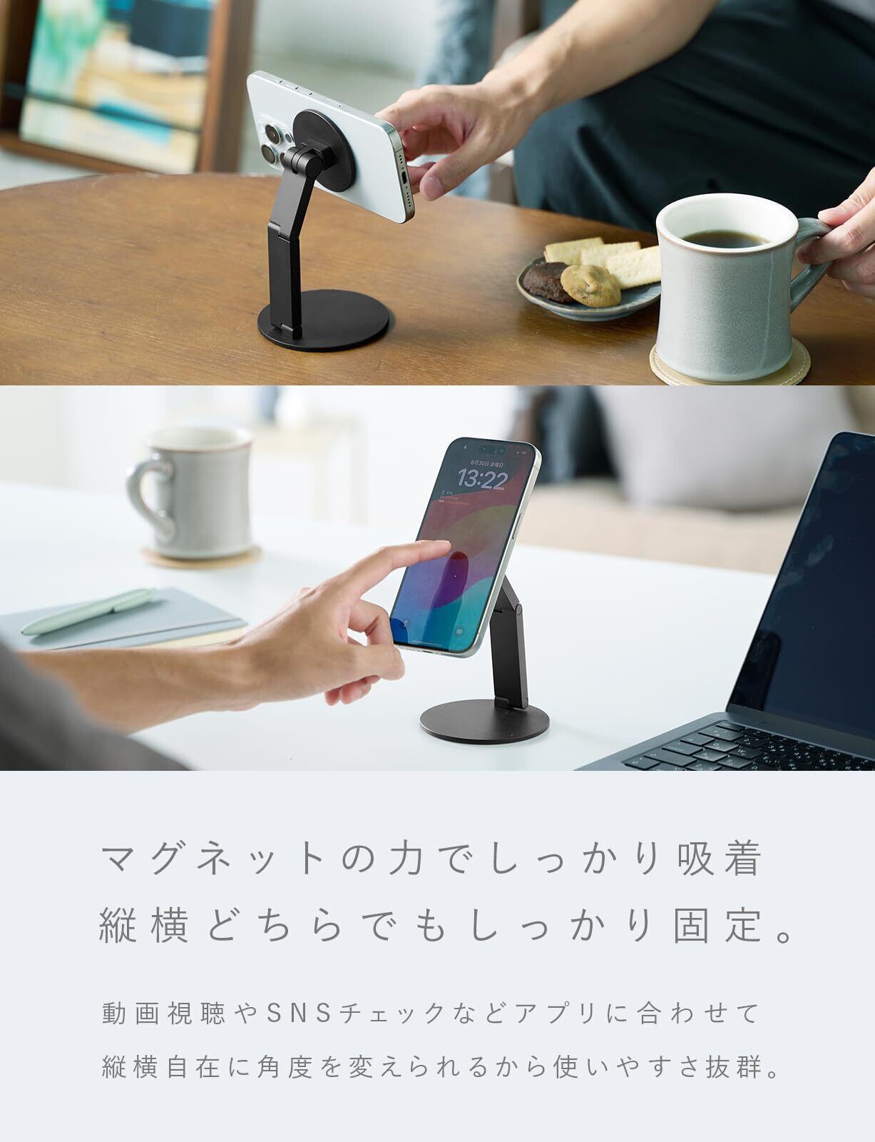 マグネット吸着タイプのスマホスタンド:強力なマグネットを内蔵しており、重量感のある台座で安定した使い心地。お仕事でも、おうちでも、スマホやタブレットになじむデザイン。※充電機能はついておりません。