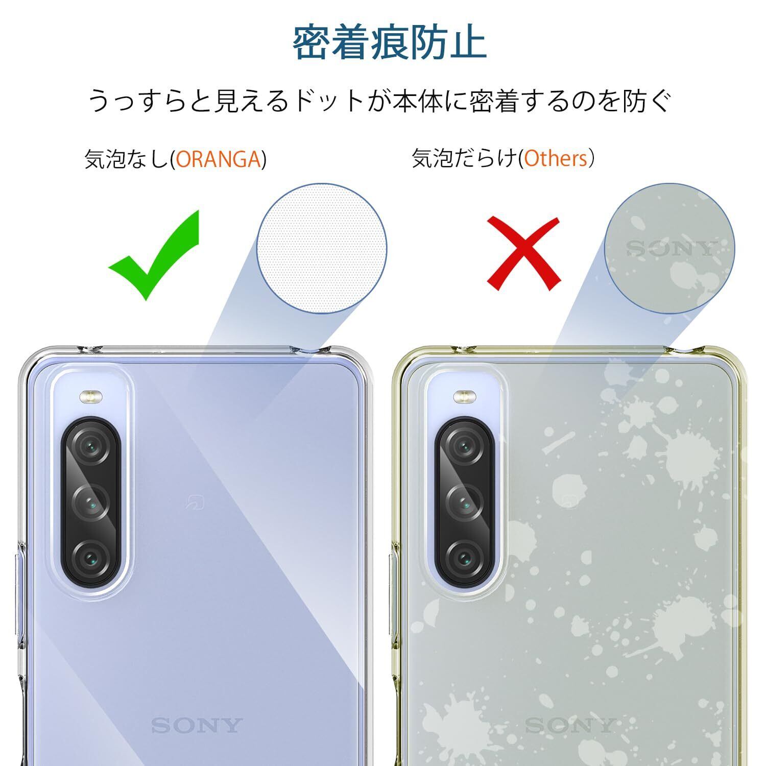 √【驚くほどの透明感&黄変防止】新先端テクノロジーADM(Anti discoloration material)をTPUに採用。黄変耐性が普通製品より20倍も高く、長く透明度を維持できます。全面透明により、Xperia10vの美しさをそのまま楽しむことが出来ます。また、ケースの内側に施された吸着に優れるマイクロドットは熱を効率的に放出し、ガラス面の水にじみを防ぎます。