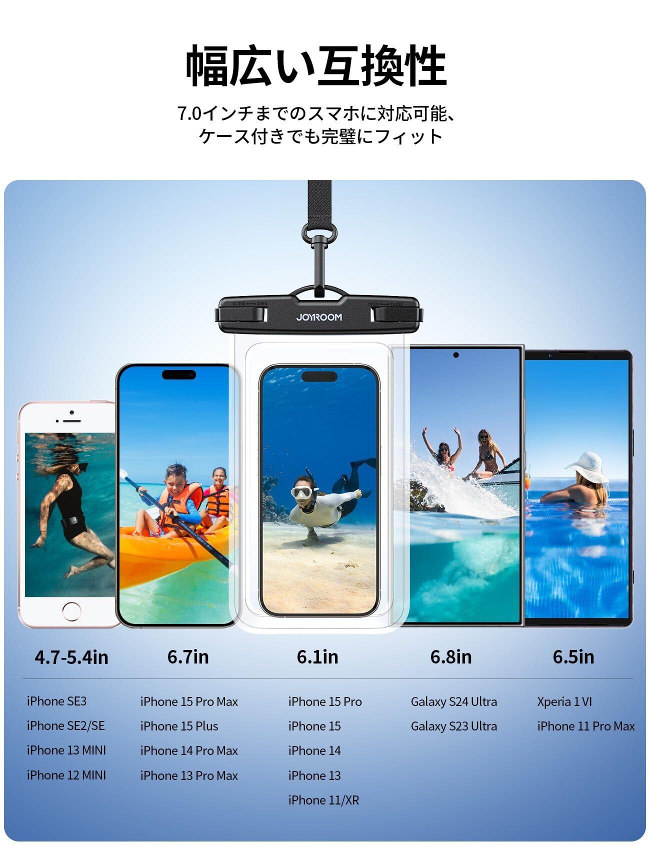 【国際認証IPX8強化防水・防塵力!安心感!】JOYROOMのスマホ防水ケースは、国際標準のIPX8防水認証を取得しており、スマホを水、雪、砂、ほこりからしっかり守ります。最新の接着技術と四層構造により、防水性能を向上。5000回以上のテストをクリアし、水深35メートルまで対応します。お風呂スマホ防水ケースとしてもプールや海水浴でも安心して使用できるスマホ防水ケースです。使用前には必ず防水テストを行い、水漏れがないか確認してください。