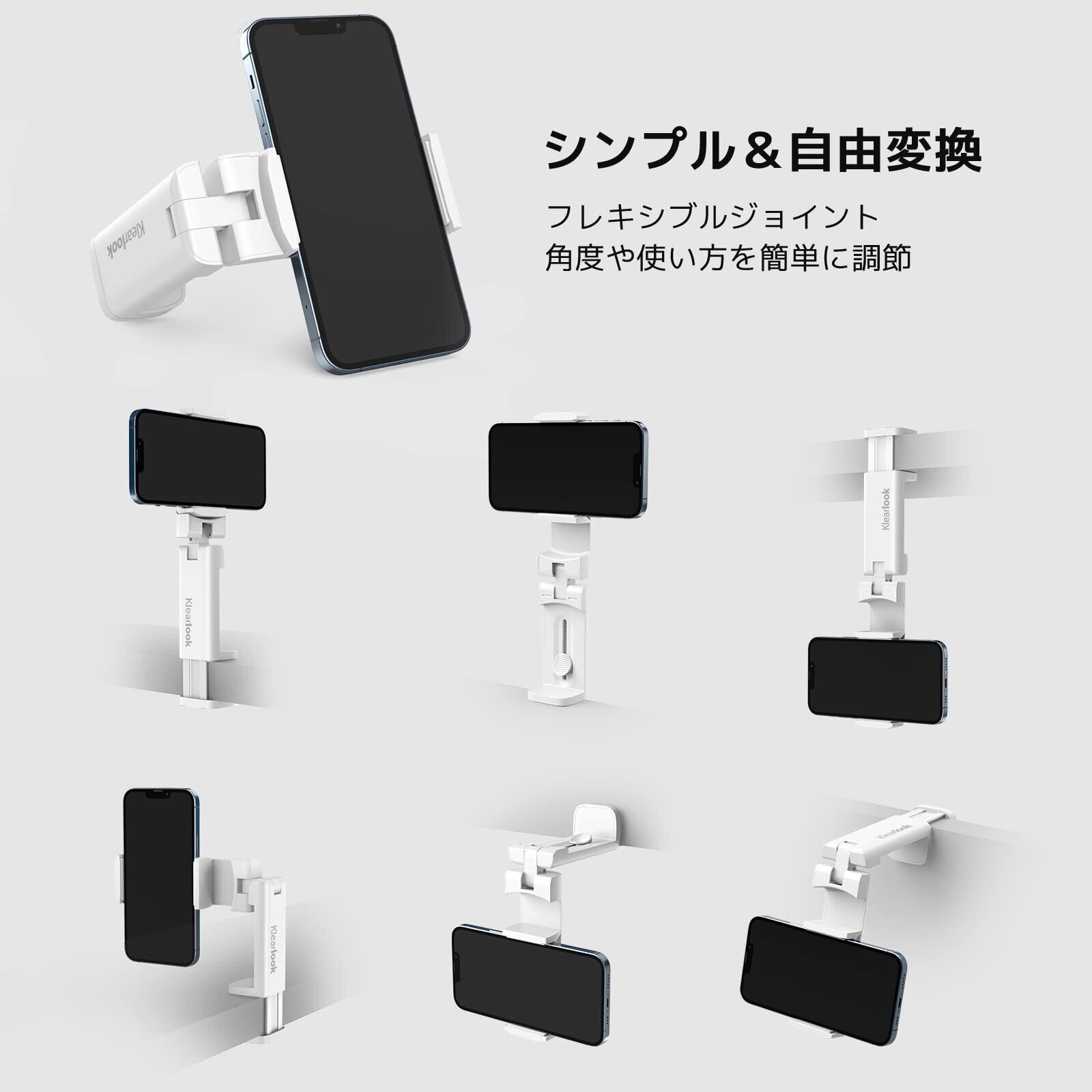 【使いやすい】使用方法としては、まず本製品を開いて、上部のホルダーでスマホを固定し、下部のクランプを開いて机の端に取り付けます。コンパクトなサイズで、簡単に収納できます。折りたたんでポケットに入れて、どこにも持ち運ぶことができます。