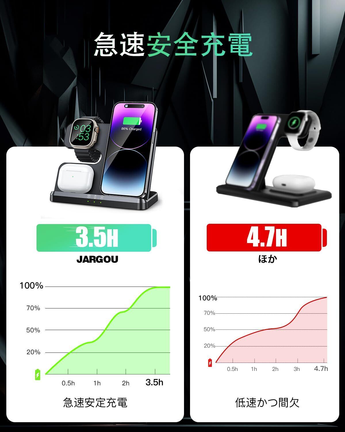 【3 in 1ワイアレス充電器】JARGOUワイヤレス充電器は人気の置き型充電器です、同時にスマホ、AirPods、iWatchを充電できます。もつれたケーブルに別れを告げ、らくらく充電に、家でも仕事でも旅行でも便利です。スマホ、イヤホン、Watchをワイヤレス充電器の上に置くだけです、すぐに充電を始めることができます。