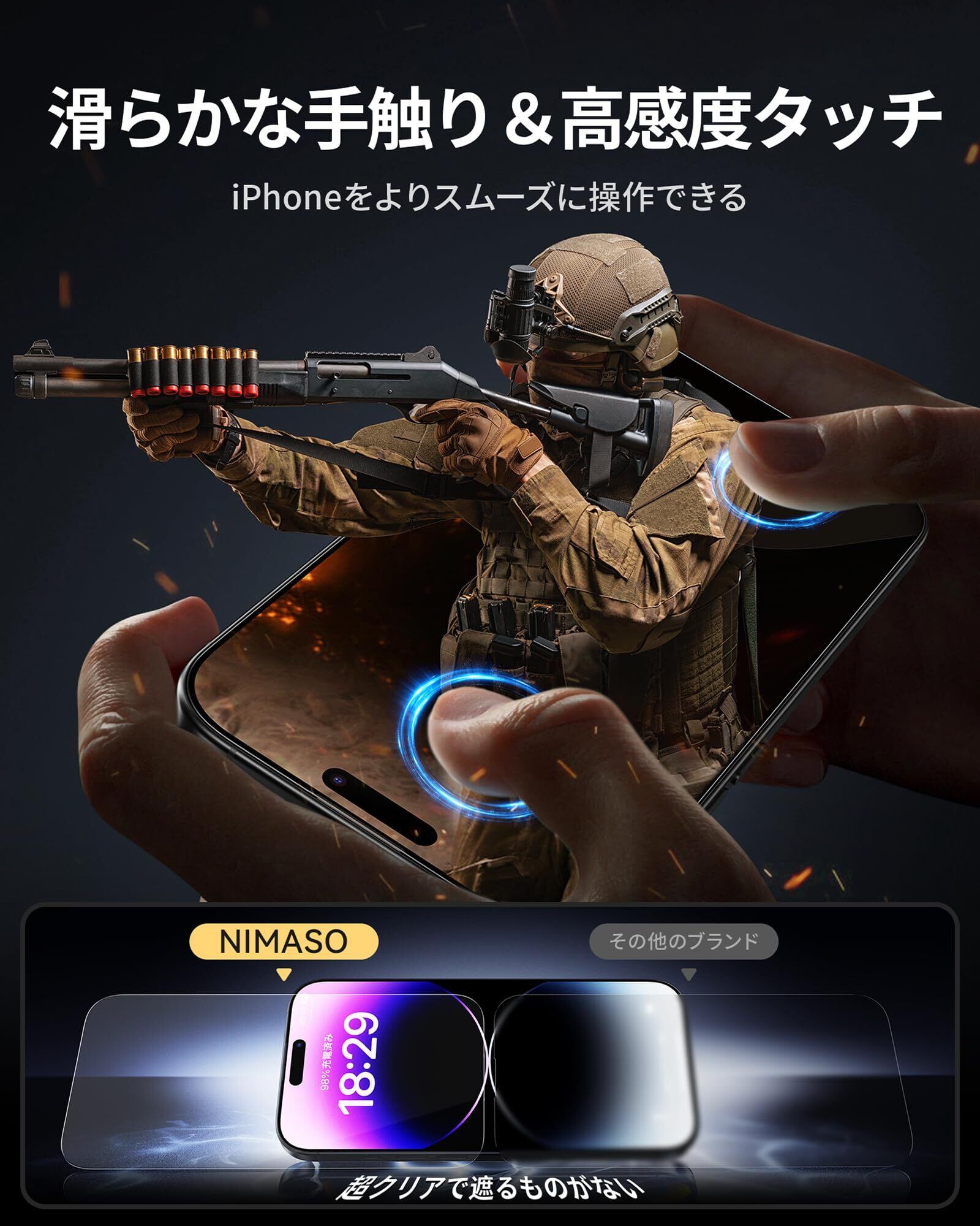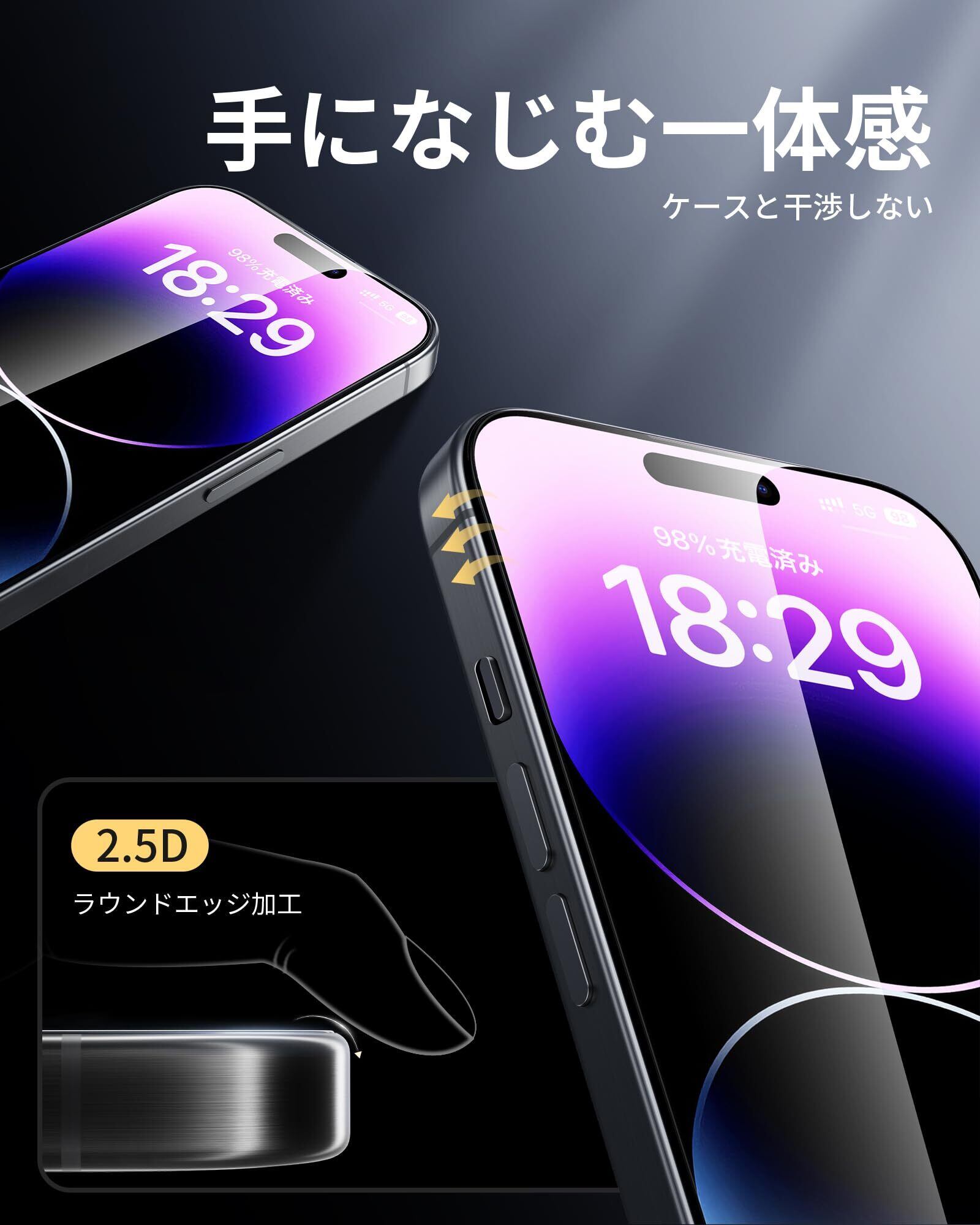 「指紋防止・滑らかな触り心地」本製品は撥水撥油のAF(Anti-Fingerprint)コーディング加工とスムースタッチ加工により、指紋や汚れがつきにくく、油分や水分が強く付着した汚れや指紋がついても、拭き取るだけで綺麗になれます。また、使用時の手触りも滑らかで、毎日のドラマ視聴やオフィス仕事、ゲームなどの邪魔になりません。常に美しいアイフォン14プロの画面をお楽しみいただけます。