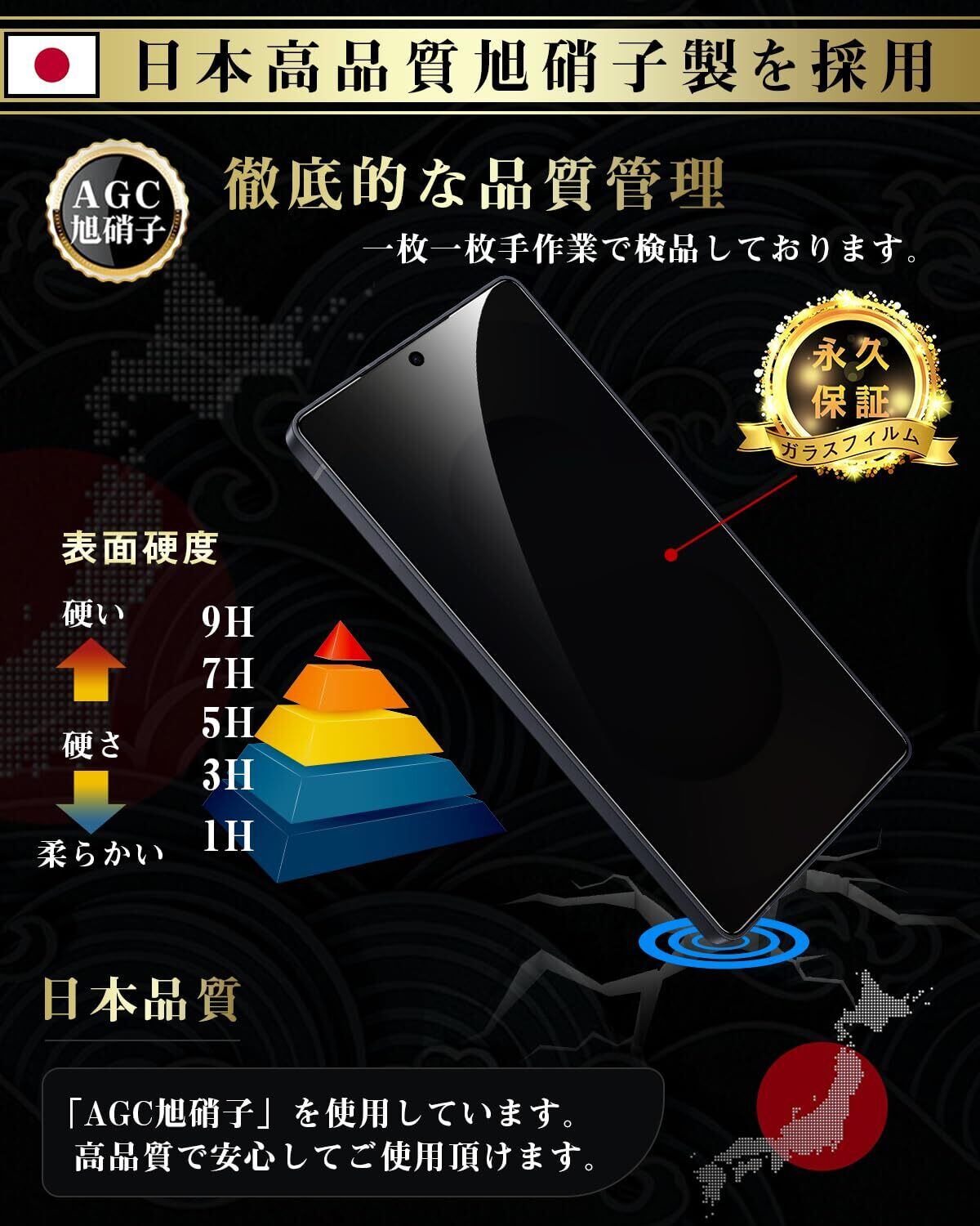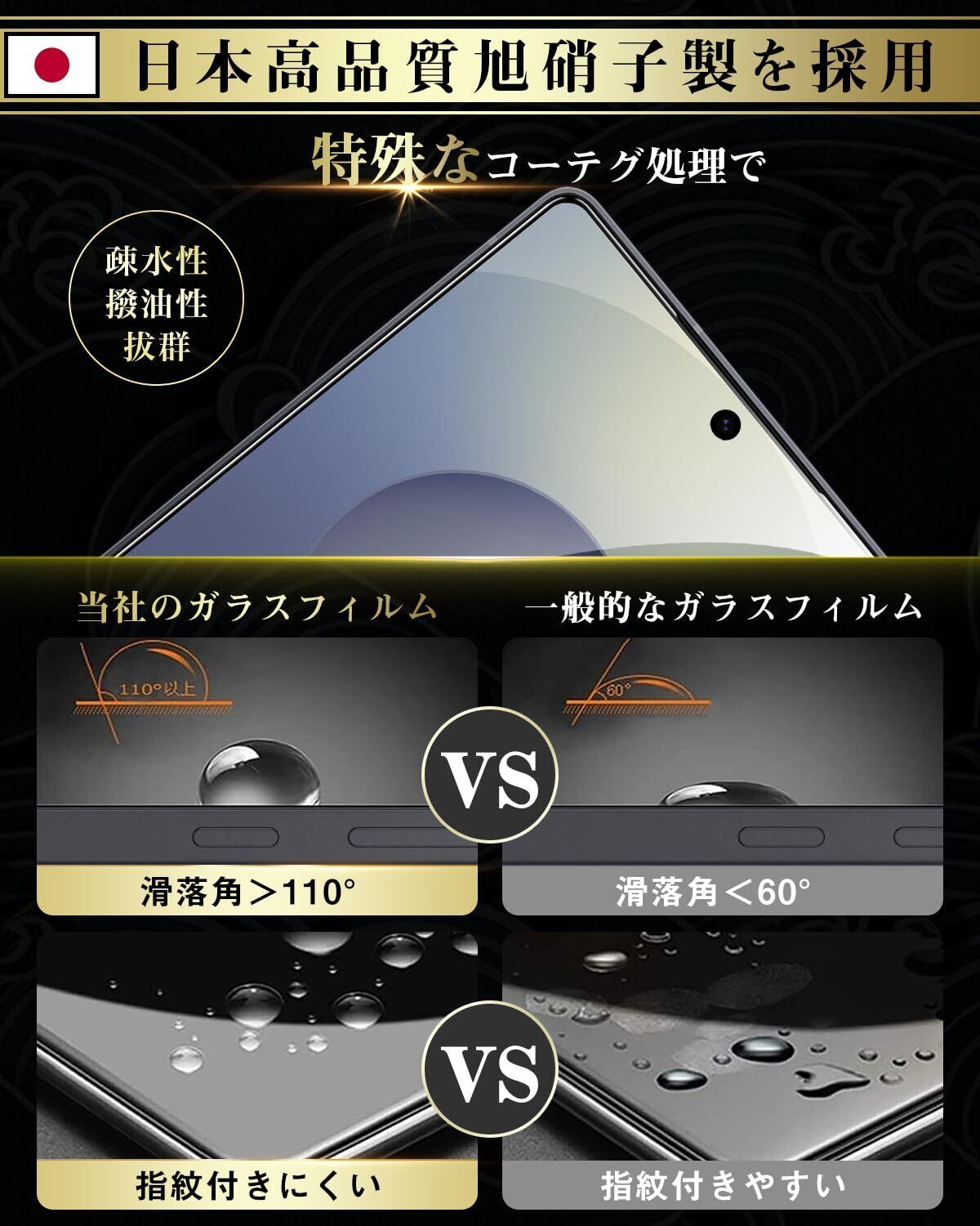 【日本旭硝子素材採用!安全安心・飛散防止設計!】 国産ガラス採用、日本旭硝子社製ガラス素材を使用します。9Hの表面硬度を誇る保護フィルムが摩擦や傷から液晶ガラスをしっかり保護します。通常のPETフィルムより6倍の強度、鍵やカッターなどの鋭利な物を当てても損傷なく使用する事が可能。万が一強力な衝撃でガラスフィルムが割れてしまっても、破片の飛び散りを防ぐ飛散防止コート処理で、画面をしっかり保護、スマホ本体と共に手の怪我の心配もありません。日常生活では、スマホを落としたり衝撃を受けたりした時に、保護フィルムがあれば、画面やレンズの破損を気にすることなく、とてもしっかりと保護することができますよね!