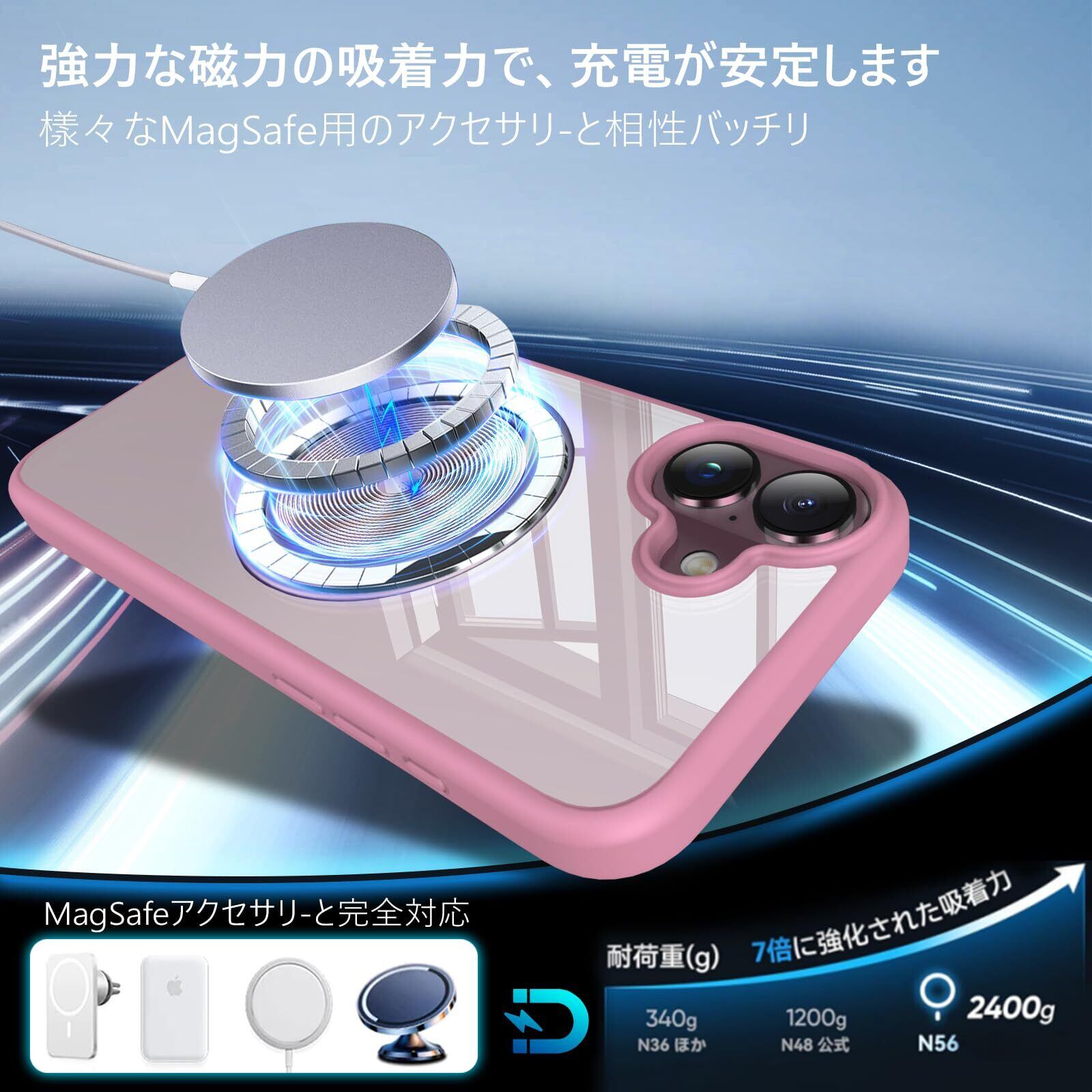 特徴 透明の背面、縦横両対応、magsafe対応、ワイヤレス充電、全面保護、耐衝撃、マグネット搭載、指紋防止、黄変防止