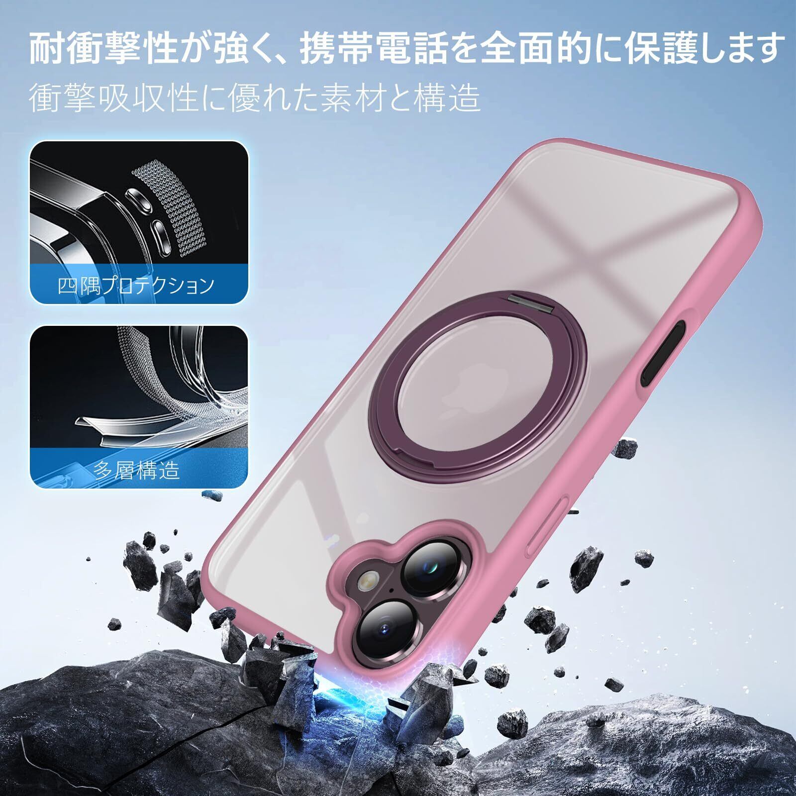 【在庫セール】【360度回転スタンド・縦横両対応】KATSUTOYO iPhone 16 用 ケース magsafe 黄ばみにくい iphone16 用 ケース 強磁力リング マグネット搭載 360°回転スタンド 縦横両対応 MagSafe対応 高耐久性 アイホン16 用 ケース 米軍MIL規格 耐衝撃 指紋防止 アイフォン16 用 ケース (6.1インチ)背殻クリア ピンク | impsmile