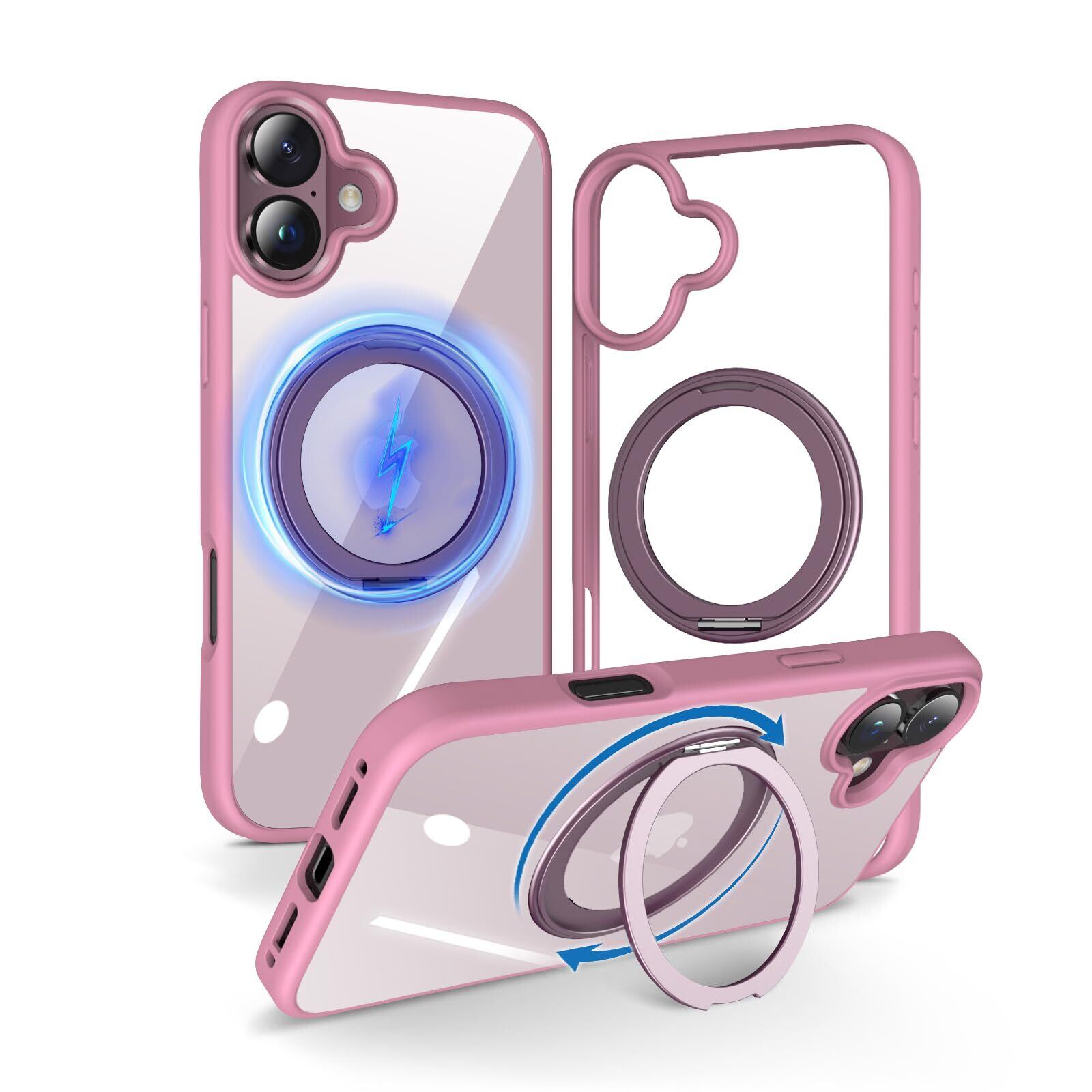 【360度回転スタンド・縦横両対応】KATSUTOYO iPhone 16 用 ケース magsafe 黄ばみにくい iphone16 用 ケース 強磁力リング マグネット搭載 360°回転スタンド 縦横両対応 MagSafe対応 高耐久性 アイホン16 用 ケース 米軍MIL規格 耐衝撃 指紋防止 アイフォン16 用 ケース (6.1インチ)背殻クリア ピンク