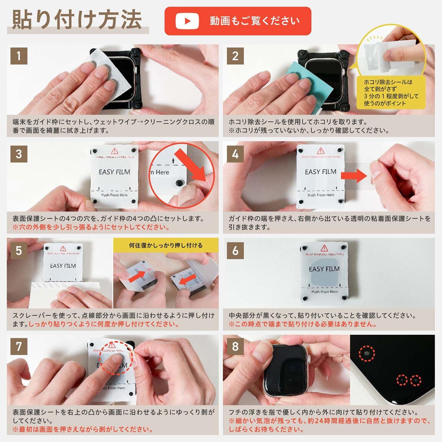 ▶▶▶【対応機種】:40mm(Apple Watch SE2 / SE / Series6 / Series5 / Series4 用) ※シリーズ・サイズは時計本体裏面の表記で確認できます。【セット内容】:フィルム × 6枚、ガイド枠 × 1個、 拭き取りシート × 6枚、ホコリ除去シール × 6枚、クリーニングクロス × 1枚、スクレーパー(ヘラ) × 1個 【貼り付けマニュアルについて】:貼り付け方法は動画をご準備しておりますので、「モンスターフィルム AppleWatch用 貼り付けマニュアル」をご覧ください。