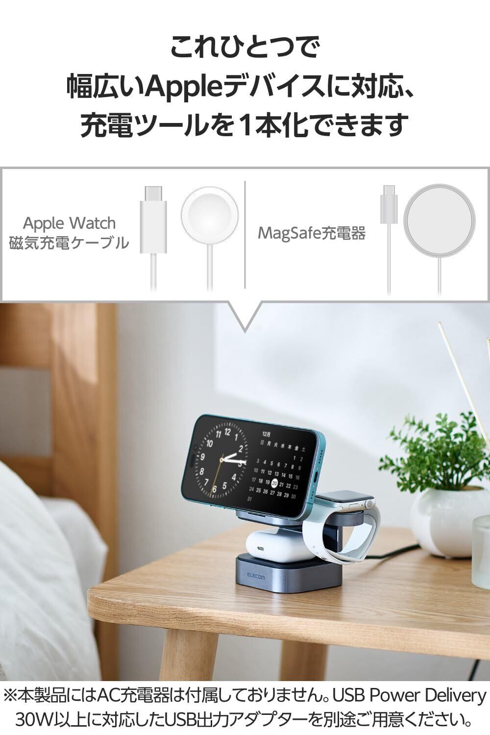 ■対応機種:スタンド部:Qi2(MPP)15W規格のワイヤレス充電に対応した機器、AirPods向けQi部:ワイヤレス充電に対応したAirPodsシリーズ(2024年10月現在)、Apple Watch充電部:Apple Watchシリーズ