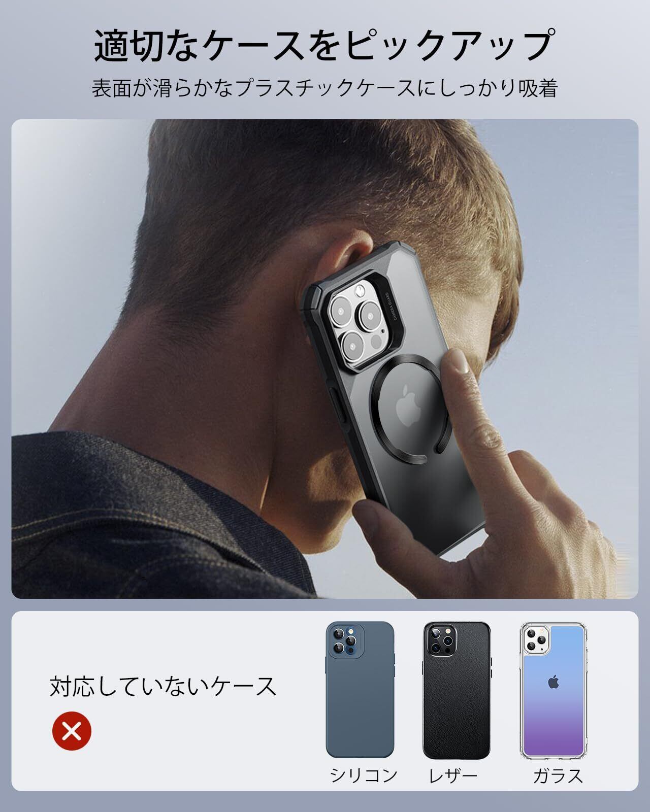【MagSafeに対応させる】お使いの標準的なケースをMagSafeに対応させ、簡単に速く磁気ワイヤレス充電できるようになります。指紋防止コーティングがついていないPCまたはTPUケースにのみ対応しています。