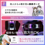 【 360度 のぞき見防止機能 】 縦持ち・横持ち両対応!どの角度からでも覗き見を防止します。電車などでも安心のプライバシー保護フィルムです。※画面を使用したバーコード決済などは、画面を明るくしてご使用ください。