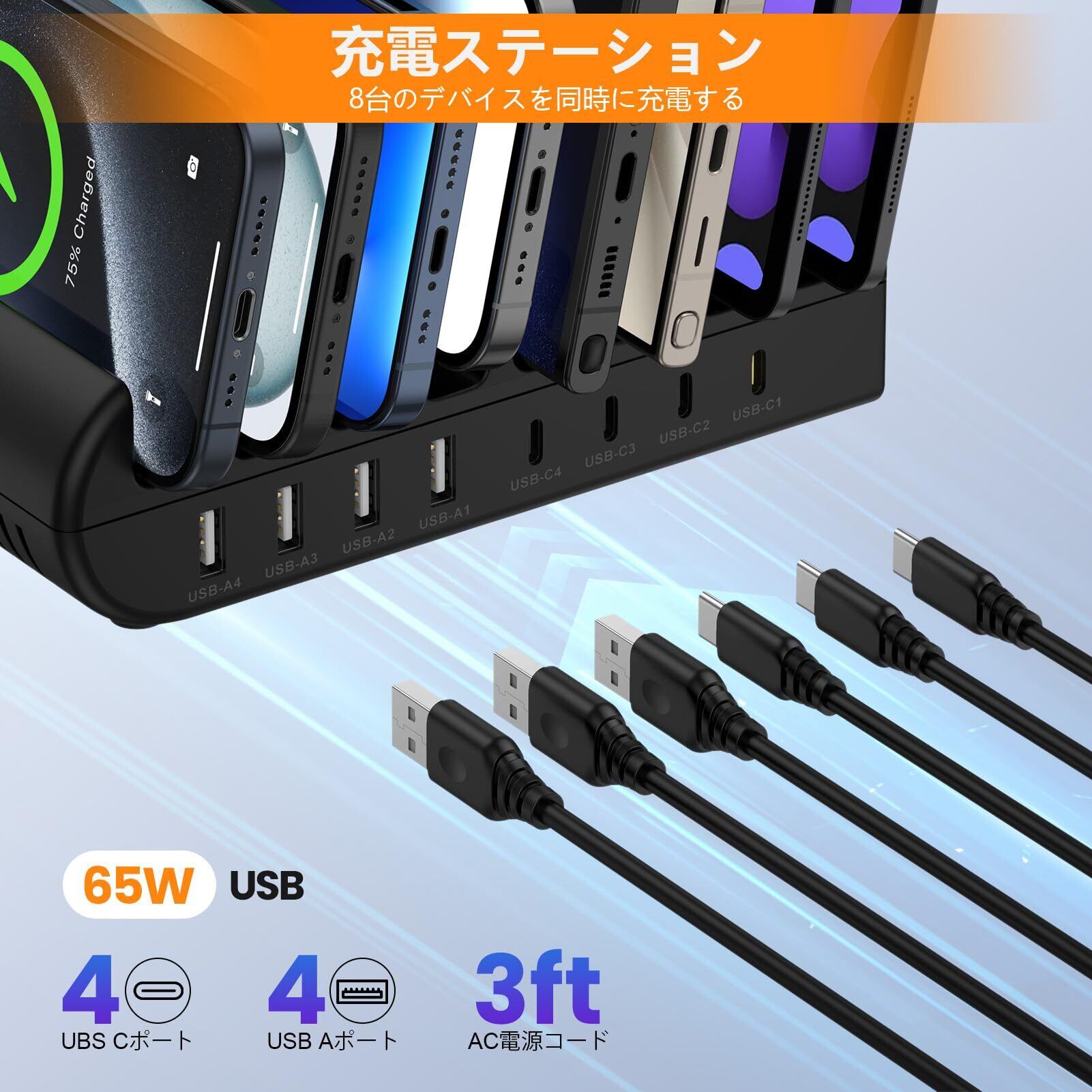 USB充電ステーション 8ポート 65W 【4*PD&4*USB A】卓上充電スタンド 複数 スマホ充電スタンド 8台同時充電 PSE認証済 複数台対応 Android/iPhone/iPad/kindle/タブレット/PSP 仕切り板 間隔調整可能 収納便利 卓上 ブラック