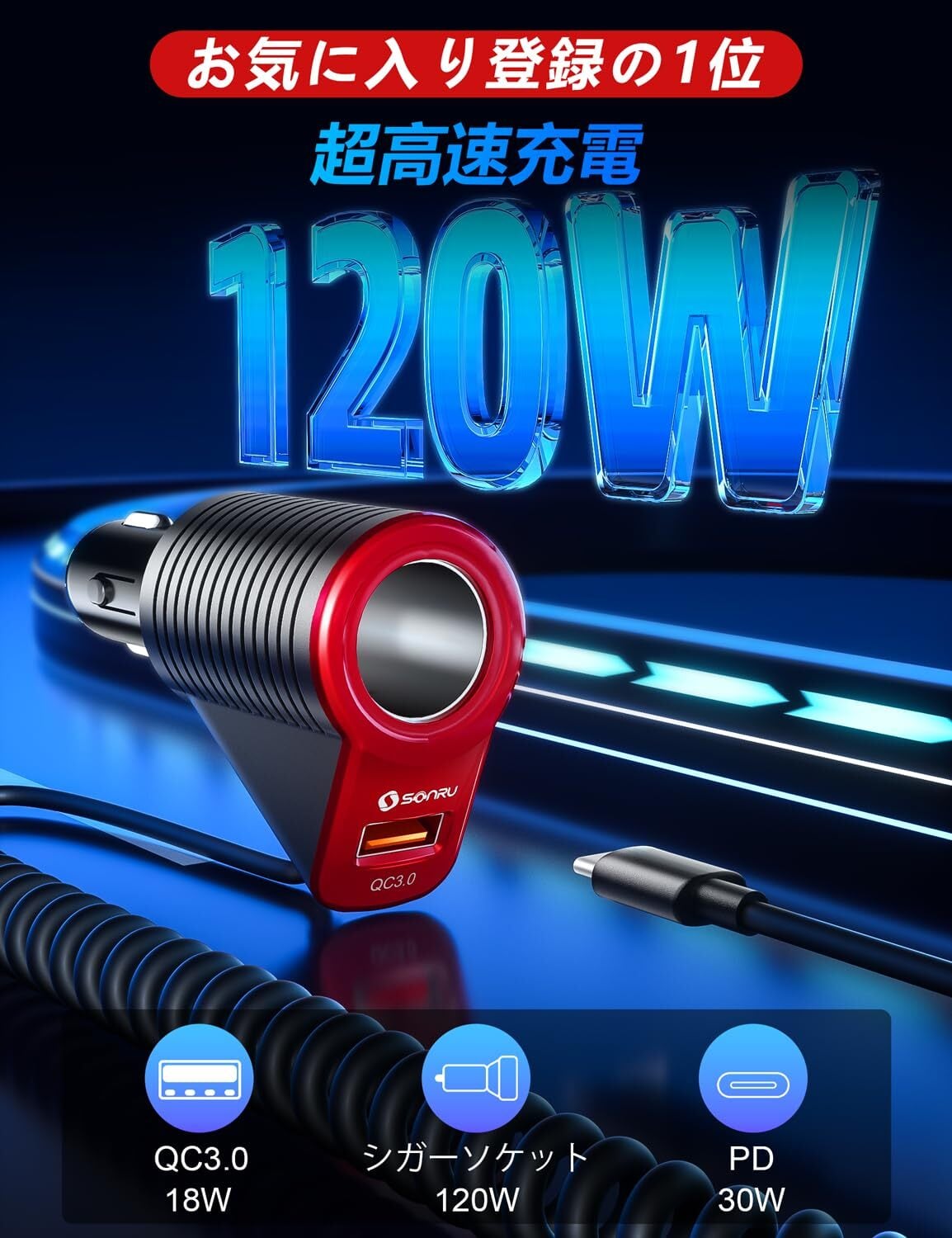 【120W急速充電】SONRU シガーソケット 増設分配器 カーチャージャーアダプターは、PD 30Wコイル式急速充電ケーブル、QC3.0 18W充電ポート、120Wシガーソケット増設分配器ています。PDおよびQC3.0急速充電をサポートし、合計出力電力120Wで、Androidスマートフォンの急速充電をします。2台のデバイスを同時に充電できます。ドライブ中に家族や友人と車の充電電力を共有しましょう。