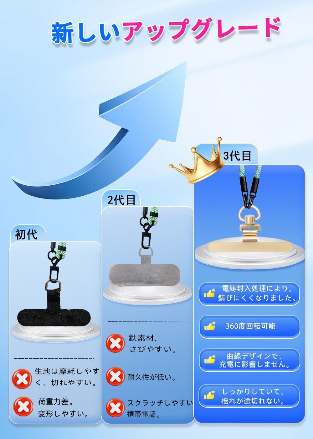 高品質のステンレス素材を使用しており、耐久性が高く、錆びにくく、長期間使用しても劣化しません。360°回転する金属軸により、スマートフォンをさまざまな角度から使用することができ、ストラップの絡まりを防ぎます。超薄型の0.2mm設計により、スマートフォンとケースの間に挟んでも浮き上がることはなく、充電や操作に影響を与えません。頑丈な「D」字形の金属リングコネクタは、高い耐荷重性を持ち、スマートフォンを完全に保護します。すべての機種に対応し、取り付けも簡単です。