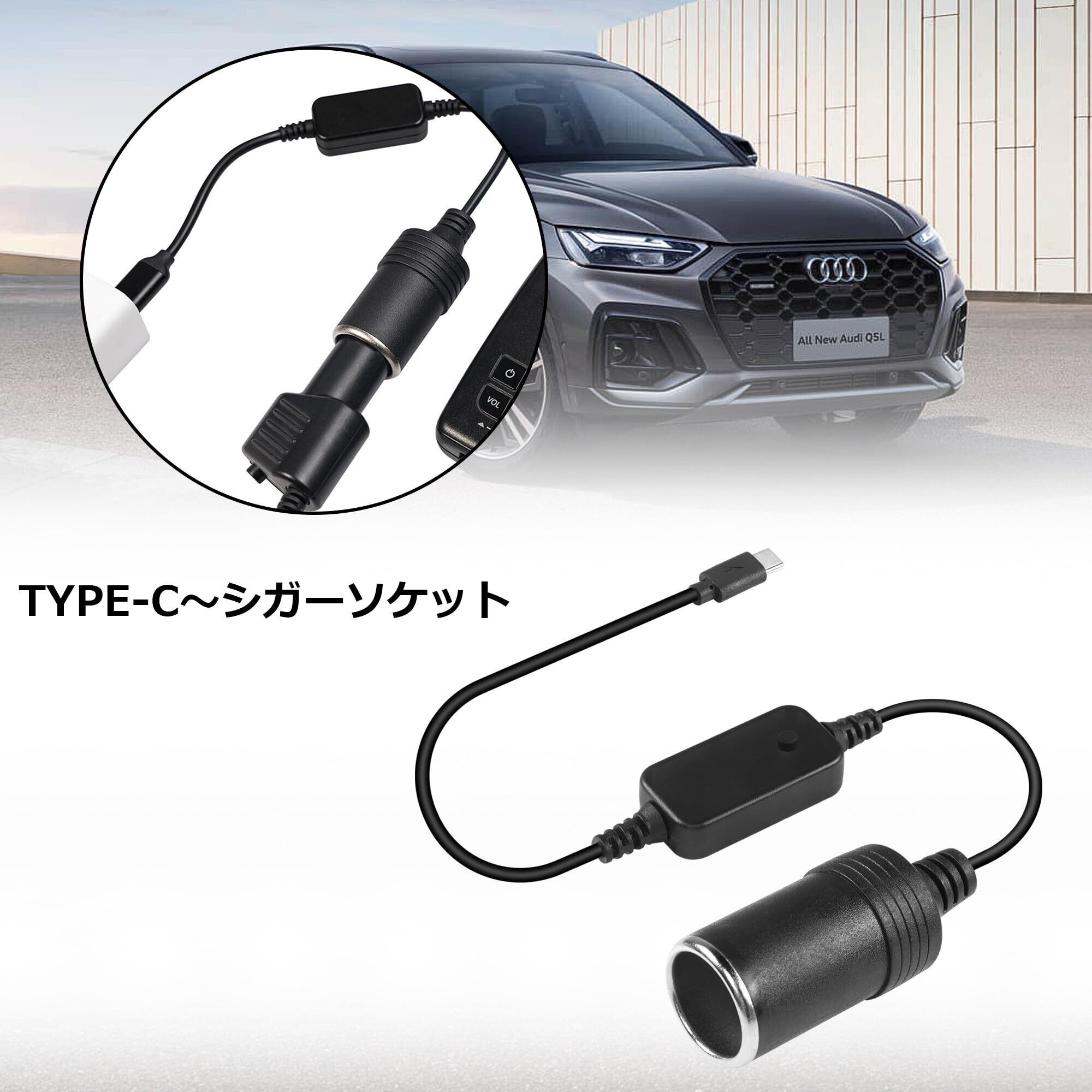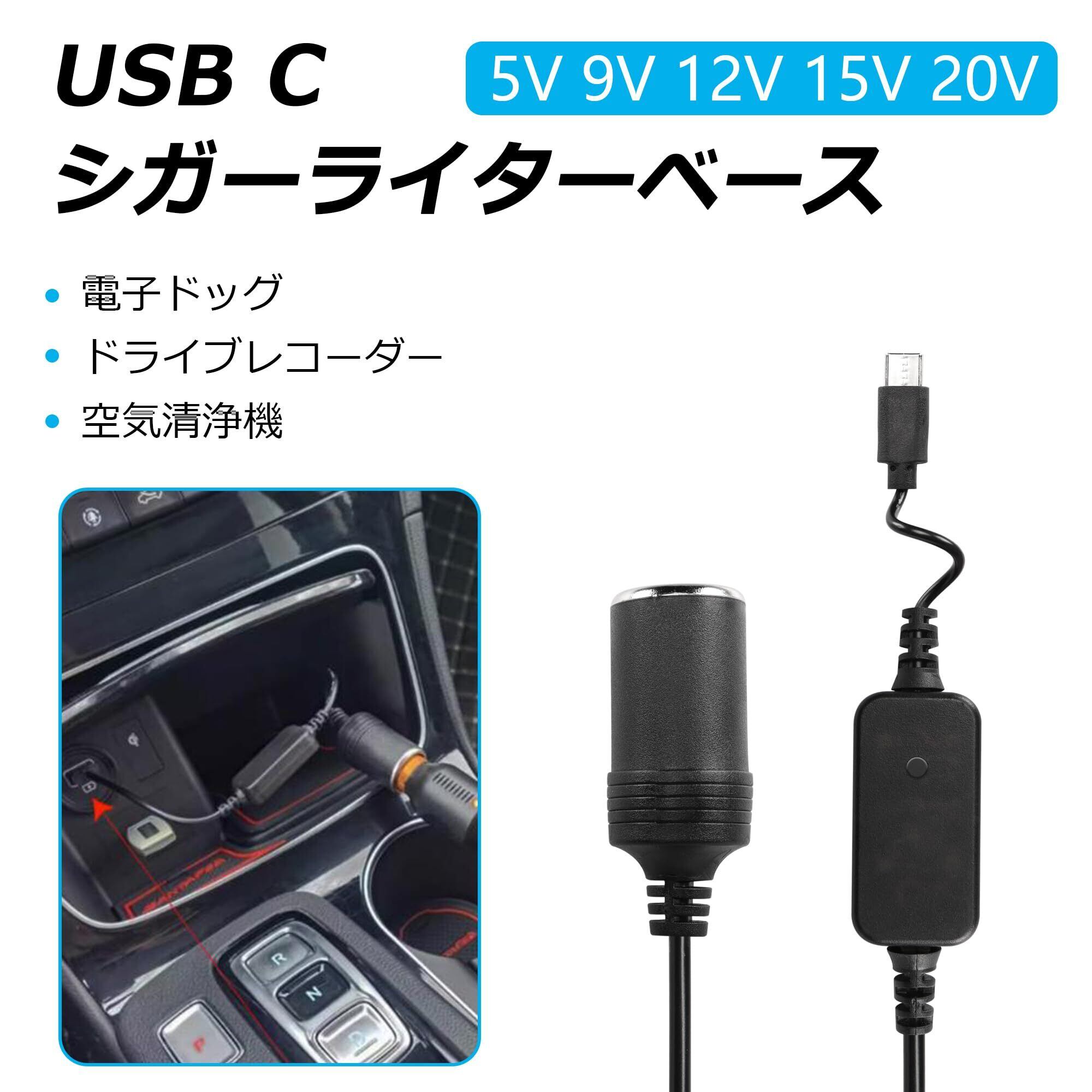 SinLoon USB Cオス-シガーライターアダプター Type-C からシガーライター電源コード 出力調整可能電圧 5V-9V-12V-15V-20V 急速充電ケーブル 最大出力60W 30CM