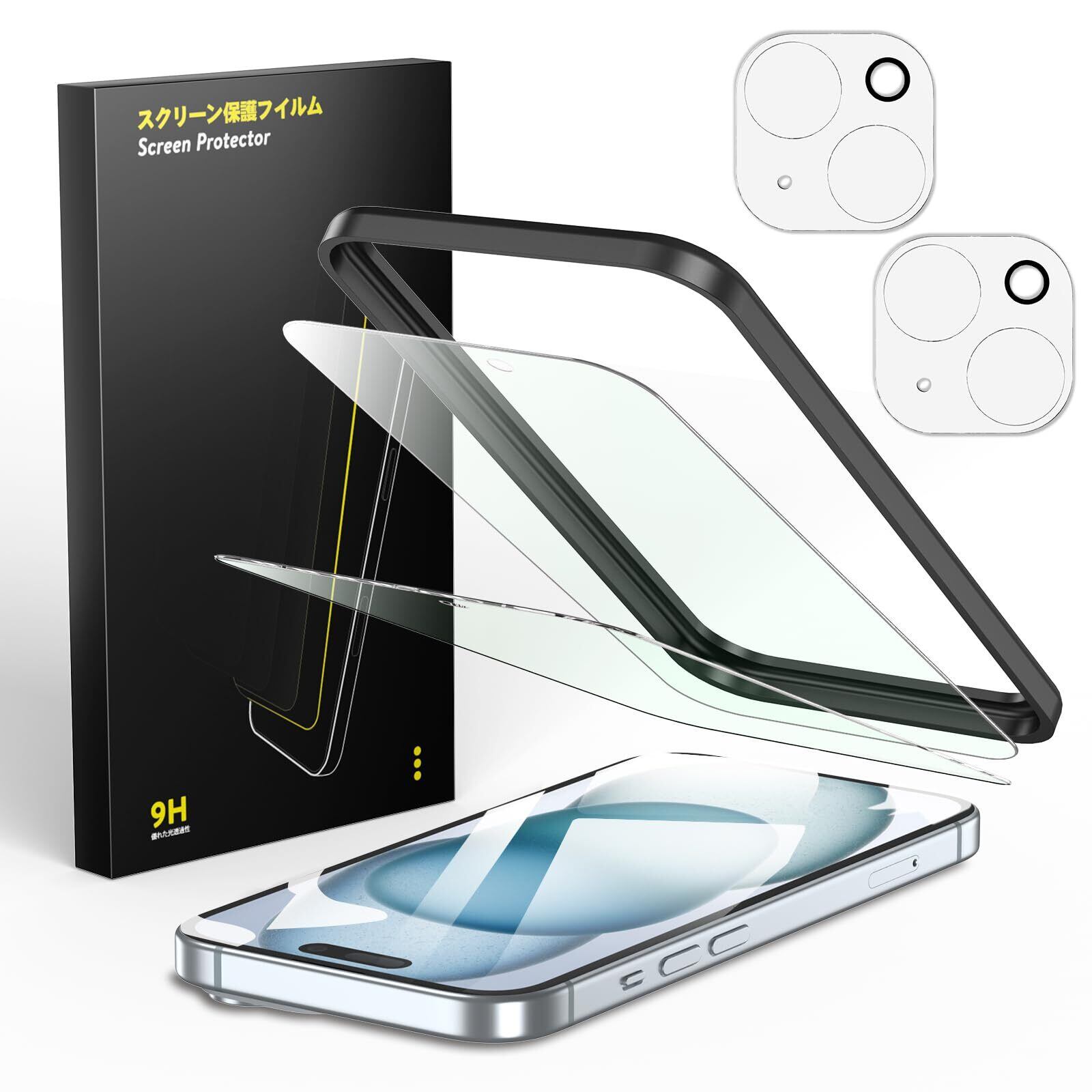 Besecou ブルーライトカット ガラスフィルム iPhone 15 用【画期的な技術・無色ARコーティング・ブルーライト防止因子】保護フィルム 2枚 + カメラフィルム 2枚 旭硝子素材製 9H硬度 米軍MIL規格 強化ガラス 耐衝撃 ガイド枠付き 液晶保護 顔認識可能 気泡防止 高感度タッチ アイフォン15 対応