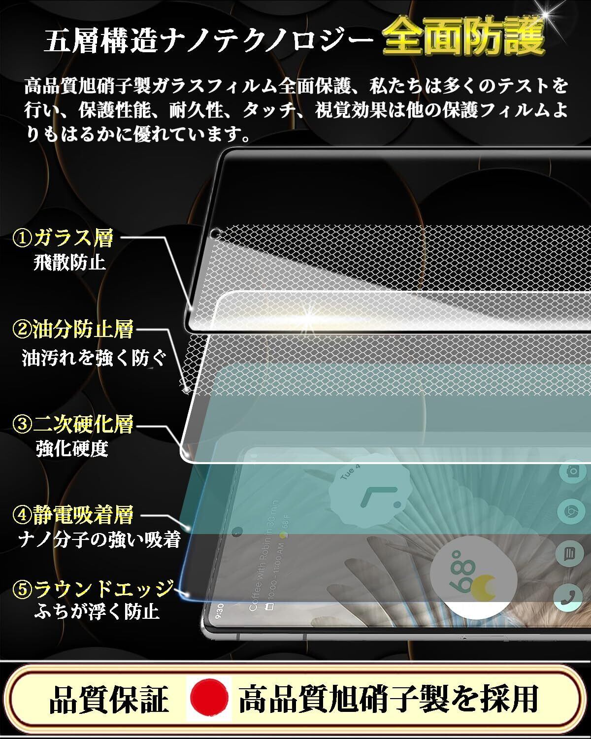 【最強硬度9H・飛散防止】Google Pixel 7 Pro 全面保護 ガラスフィルムは日本旭硝子素材を使用、日本旭硝子社製ガラス素材は通常のPETフィルムより4倍の強度です。スマホのリアルなサイズにより製造、高品質製品の製作プロセスに厳しく基づき、カット加工、精密に彫刻、ライトスイープ、超音波清潔、強化、検査、袋詰め七つのステップを経てスマホに完璧的にフィットした製品を製造されます。