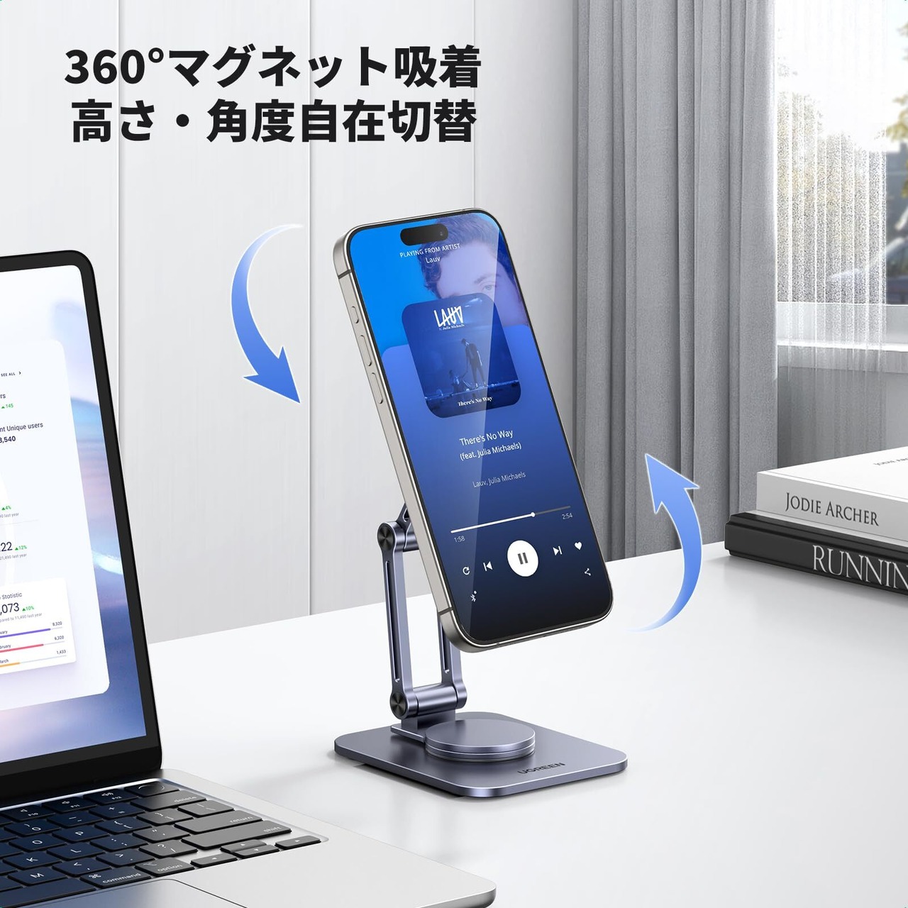 UGREEN スマホスタンド magsafe対応 magsafe スタンド 折りたたみ式 360度回転可能 マグセーフ スタンド マグネット 卓上用 携帯スタンド 持ち運ぶ便利 iphoneスタンド アルミ製スタンド iPhone 16/15/14/13/12 Pro Max/Pro/Plus/Miniに対応