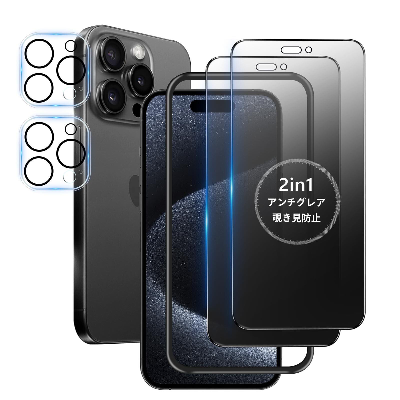 【覗き見防止 + アンチグレア / 2枚セット】 iPhone 15 Pro ガラスフィルム 覗き見 さらさら いPhone15Pro 保護フィルム サラサラ アイフォン15プロ 覗き見防止フィルム 指紋防止 iPhone15 Pro カメラフィルム 付き