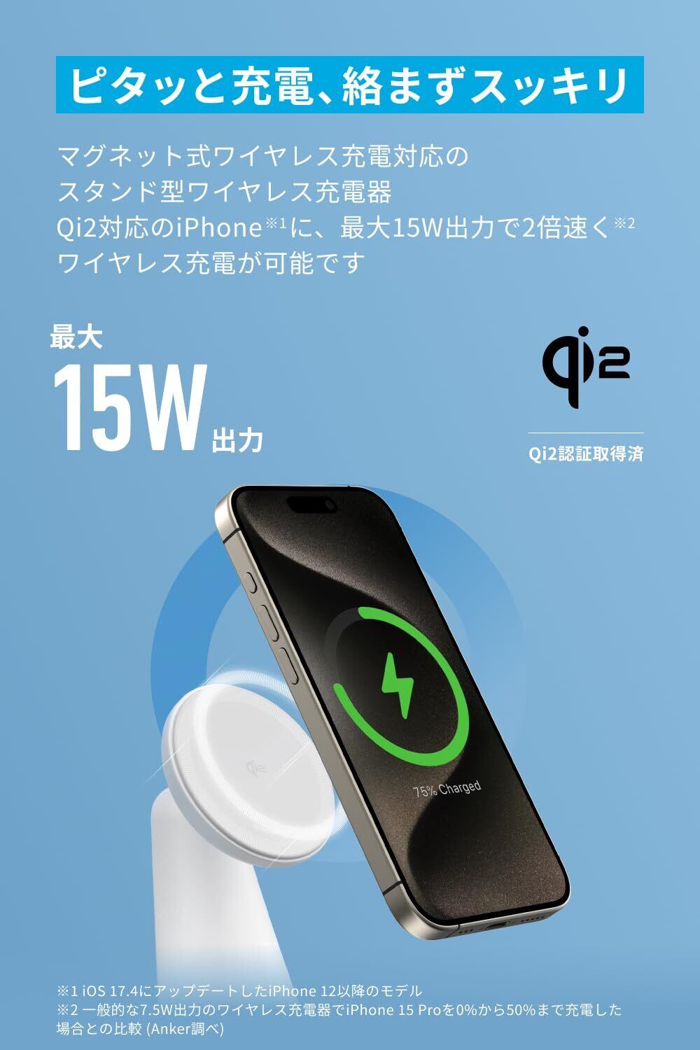 ピタッと充電、絡まずスッキリ:マグネット式ワイヤレス充電対応の2-in-1充電器。Qi2対応のiPhoneに従来のAnker MagGoシリーズの2倍の最大15W出力でワイヤレス充電が可能です。