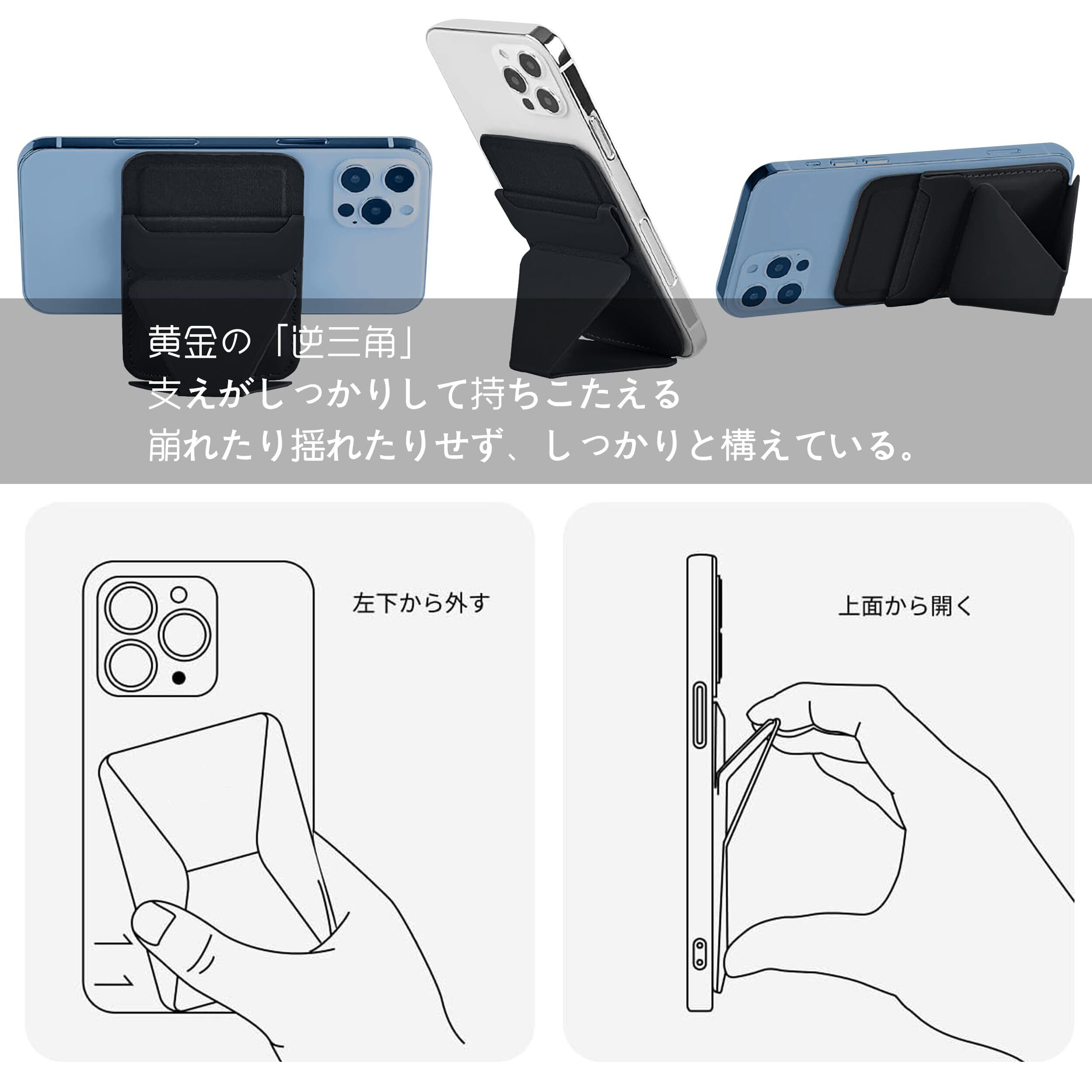 スマホ カードケース スマホスタンド カード入れ 簡単カード収納 Magsafe対応 スタンド機能付き スタンド 背面カード収納 マグネット内蔵 iPhone AQUOS Xperia Galaxy など スマートフォン 全機種対応 カードホルダー 角度調整 持ち歩き便利(ブラック)
