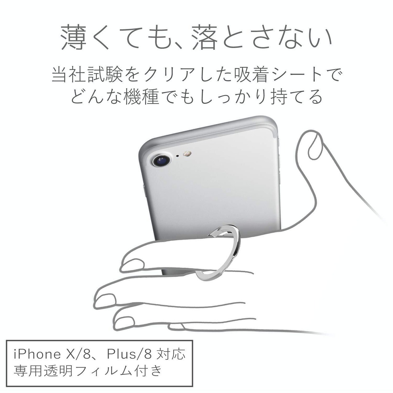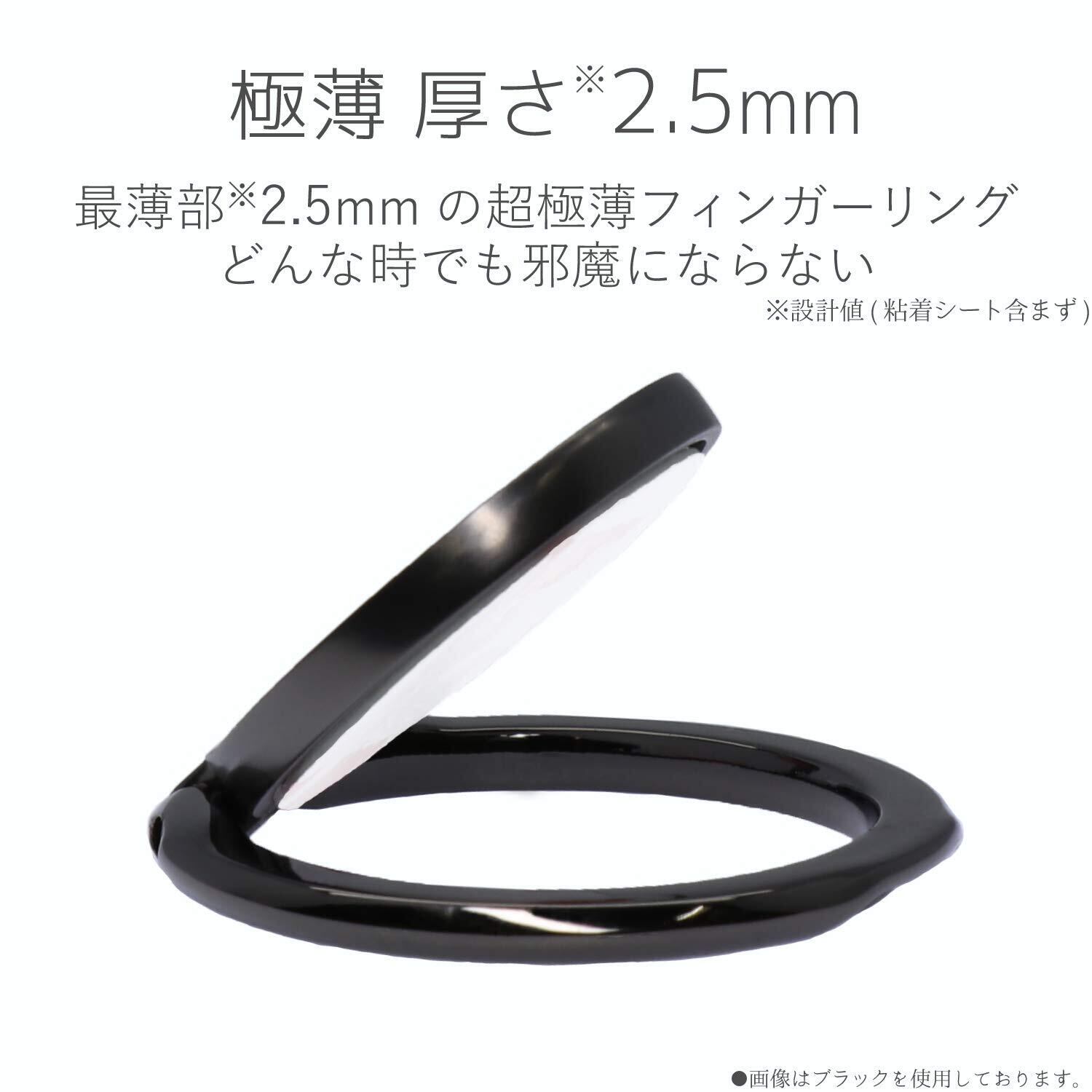 ●背面に貼りつけることで指を通してスマートフォンを持つことができ、スマートフォンの落下を防ぐフィンガーリングです。●最薄部約2.5mmで、ポケットの出し入れなどでも邪魔にならない極薄設計です。※設計値(粘着シート含まず)●持ち方に合わせてリングが回転し、持ちやすい角度に調整可能です。●動画視聴時にリング部分がスタンドになる、便利なスタンド機能がついています。●エレコム社試験をクリアした吸着シートにより、使用中にスマートフォンから剥がれるのを防止します。