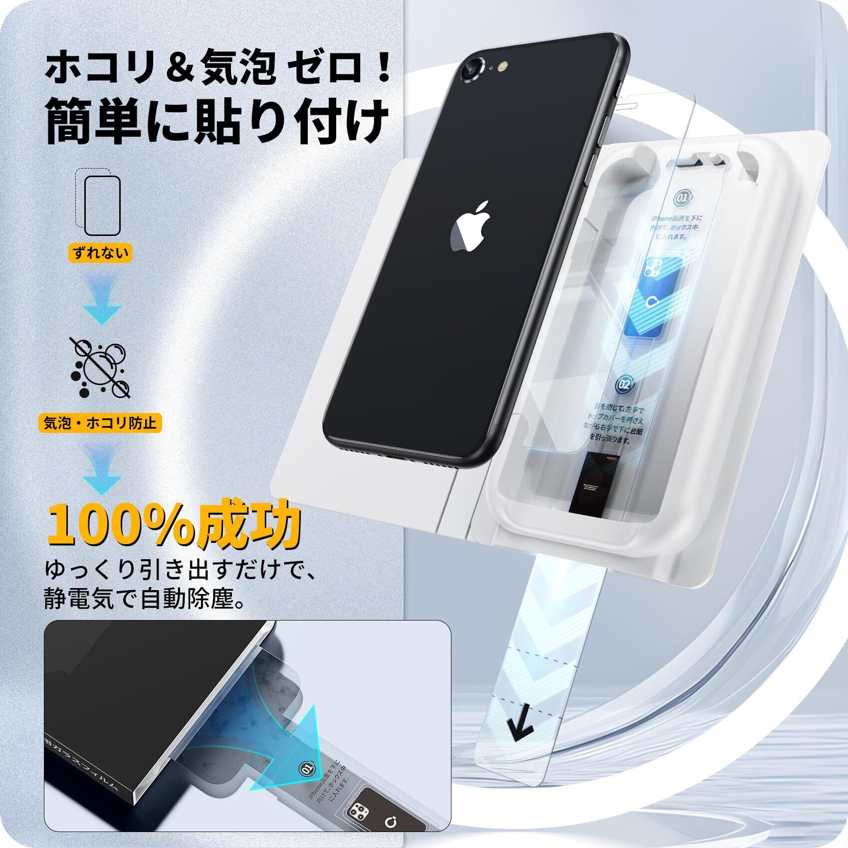 「バリ楽Box」NIMASO ガラスフィルム iPhone SE3 /iPhone SE2 /iPhone 8 7 6 6s用 強化ガラス 保護フィルム 失敗なし 超簡単貼り付け 気泡ゼロ 指紋防止 ホコリ自動吸着 自動除塵セット付き 2枚セット SE 第2世代 第3世代 対応 NSP24D1215