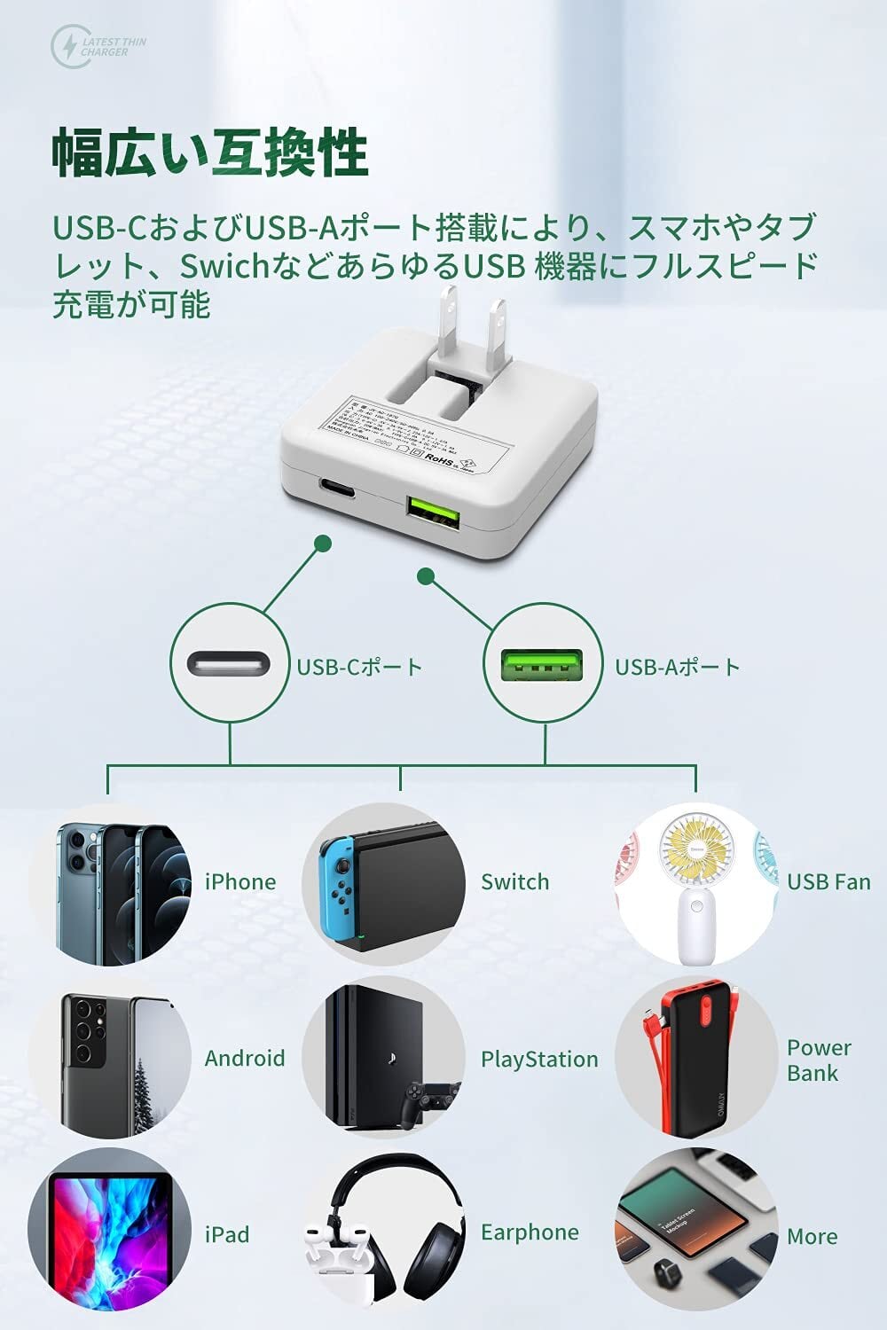 【USB-CとUSB-A両ポート超薄型】16MMで超薄型タイプのUSB充電器、縦並びのコンセントで上下を邪魔せずお気軽に使えます。薄型の割にPD20w対応のUSB-CポートとQC3.0対応のUSB-Aポートを各1つ搭載します。従来のUSB Aで充電できるスマホはもちろん対応できますが、最先端充電規格PDにも対応し、お手元デバイスの充電を全方位サポート致します。※ケーブルが付属しませんので、ご了承ください。