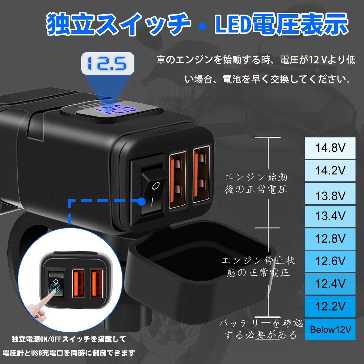 XBERSTAR バイク USB電源 USB充電器 車載充電器 防水 2ポートType-c電源 急速充電 電圧計付 安全ON/OFFスイッチ付 QC3.0過圧保護 2つのインストール方法 取付簡単 1つのSAEソケット+1メートルのダブルSAEソケットケーブル【対応携帯電話、タブレット、ナビゲーション、GPS】 (ブラック)