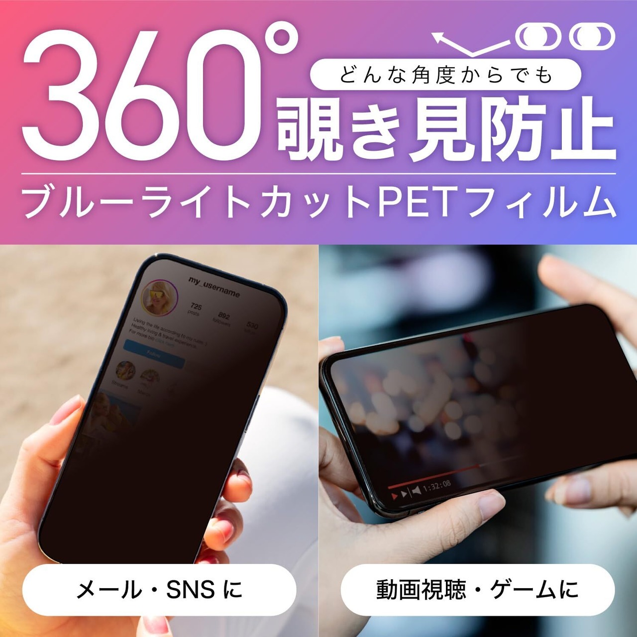 【 360度 のぞき見防止機能 】 縦持ち・横持ち両対応!どの角度からでも覗き見を防止します。電車などでも安心のプライバシー保護フィルムです。※画面を使用したバーコード決済などは、画面を明るくしてご使用ください。