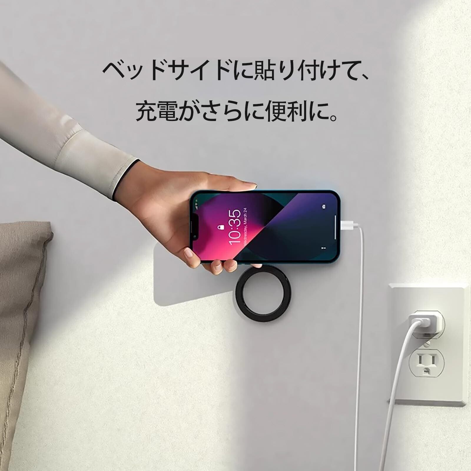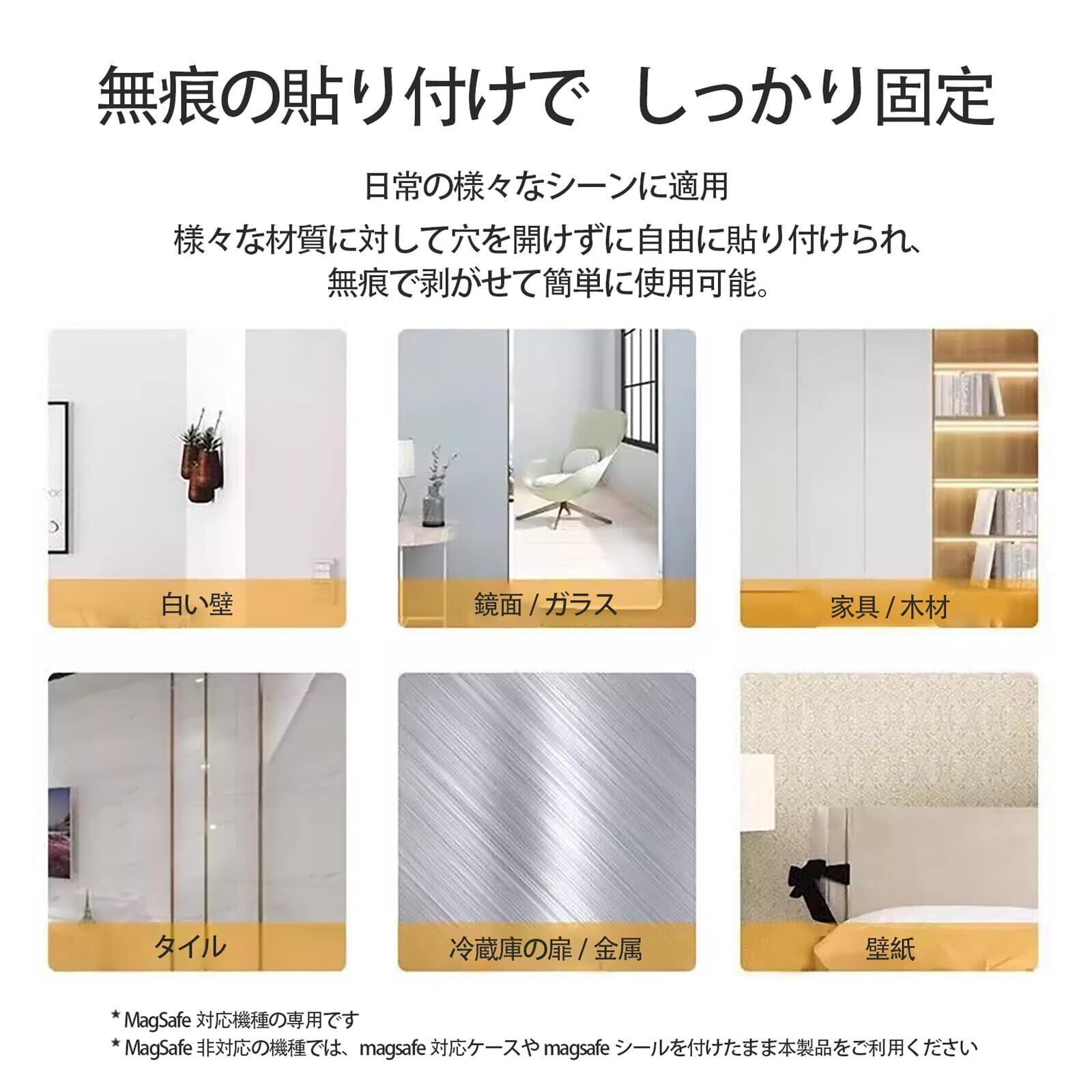 【Mag-Safeで吸着させる壁マウント】貼り付けるだけで使える。Mag-Safeの強力磁力でiPhone 12以降の機種をしっかり固定し、縦向き横向きどちらでも安定して設置できる壁掛けタイプ。