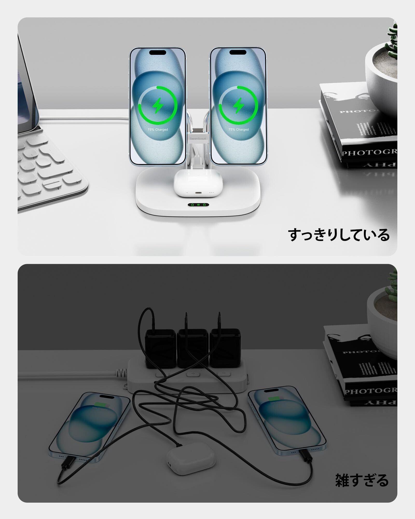 コンパクトなデザイン:イヤホン用のワイヤレス充電パッドを内蔵しており、さらに便利です。この3-in-1充電ステーションは、充電スペースを整理するのに最適なコンパクトなソリューションを提供し、乱雑さを軽減します。