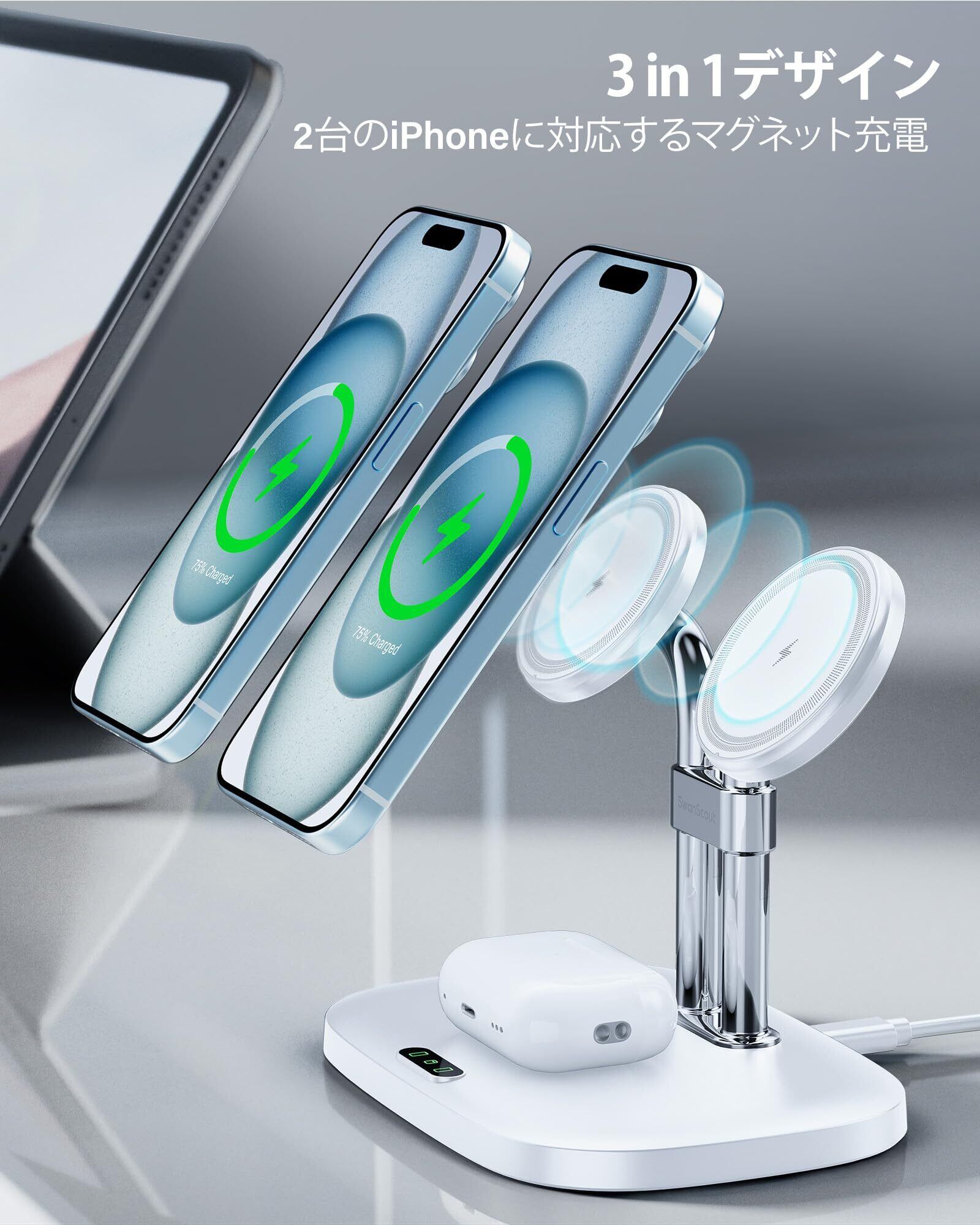 iPhone 16 15に対応ワイヤレス充電器、SwanScout 706M、デュアル mag-safe 充電器 iPhone 16/15/14/13/12シリーズ対応、AirPods 4/Pro 2/Pro/3対応 (ホワイト)