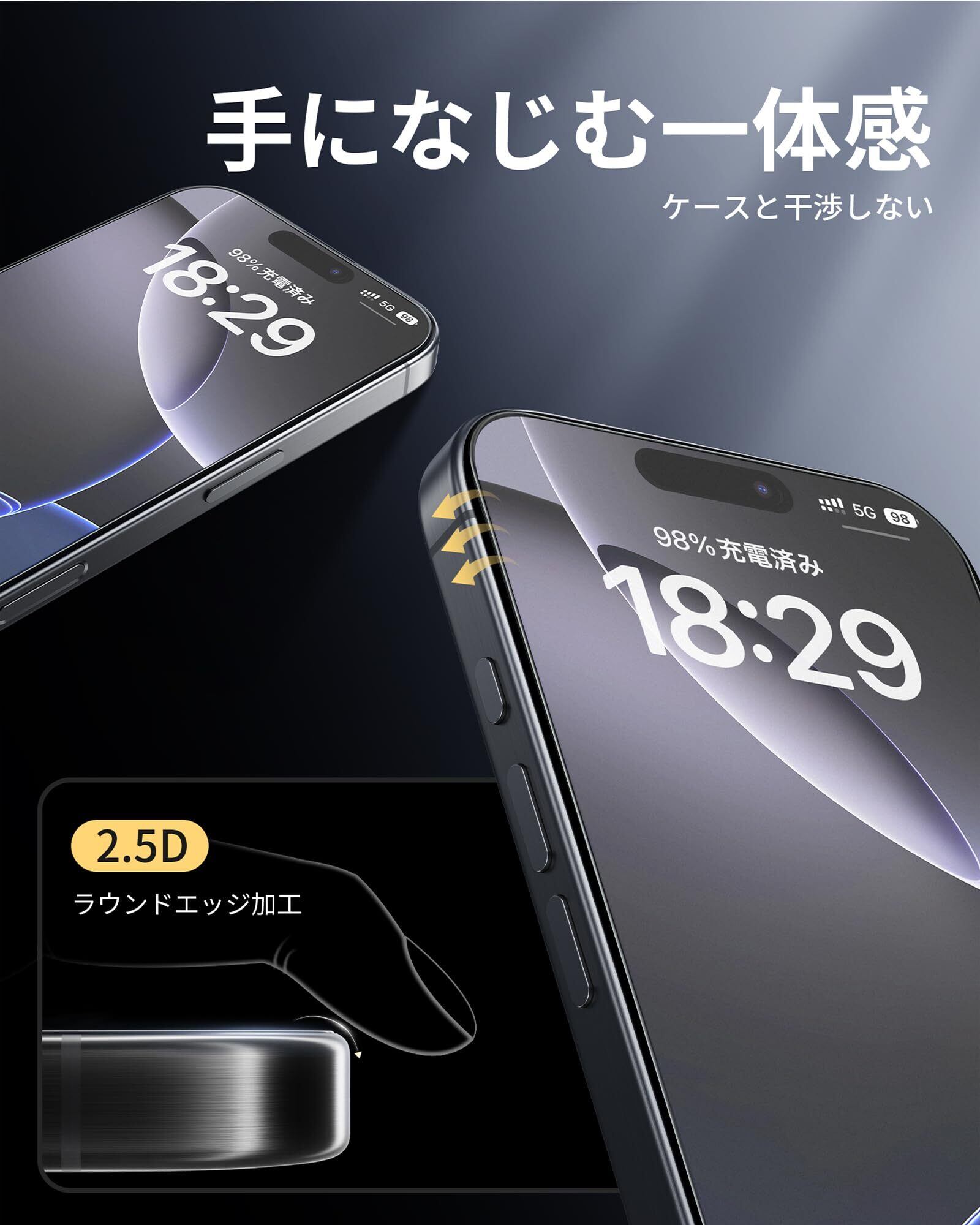 「指紋防止・なめらかなタッチ感度」本製品は撥水撥油のAF(Anti-Fingerprint)コーディング加工とスムースタッチ加工により、指紋や汚れがつきにくく、油分や水分が多く含む汚れや指紋がついても、拭き取るだけで綺麗になります。また、使用時の手触りも滑らかで、動画視聴や仕事中の作業、ゲームなどの邪魔になりません。常に美しいアイフォン16 プロマックスの画面をお楽しみいただけます。
