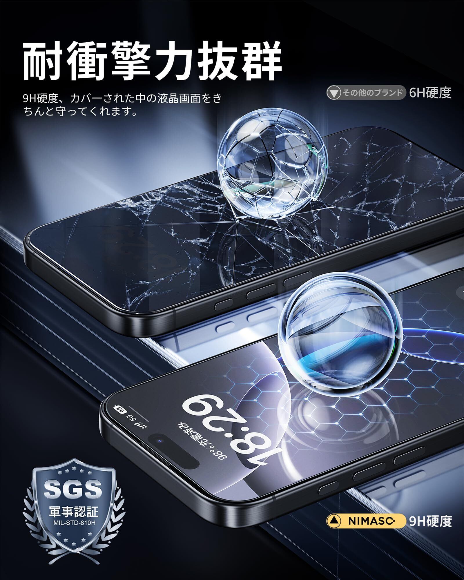 「9H硬度・耐衝撃性アップ」9H表面硬度ガラスを採用し、スマートフォンがカバンの中で、鍵などの鋭いものにぶつかっても傷が付きにくく、iphone16 promaxの画面をしっかり保護します!特殊な飛散防止設計により、万一割れてしまった際にもガラス片が飛散することなく、高い安全性を実現しています。