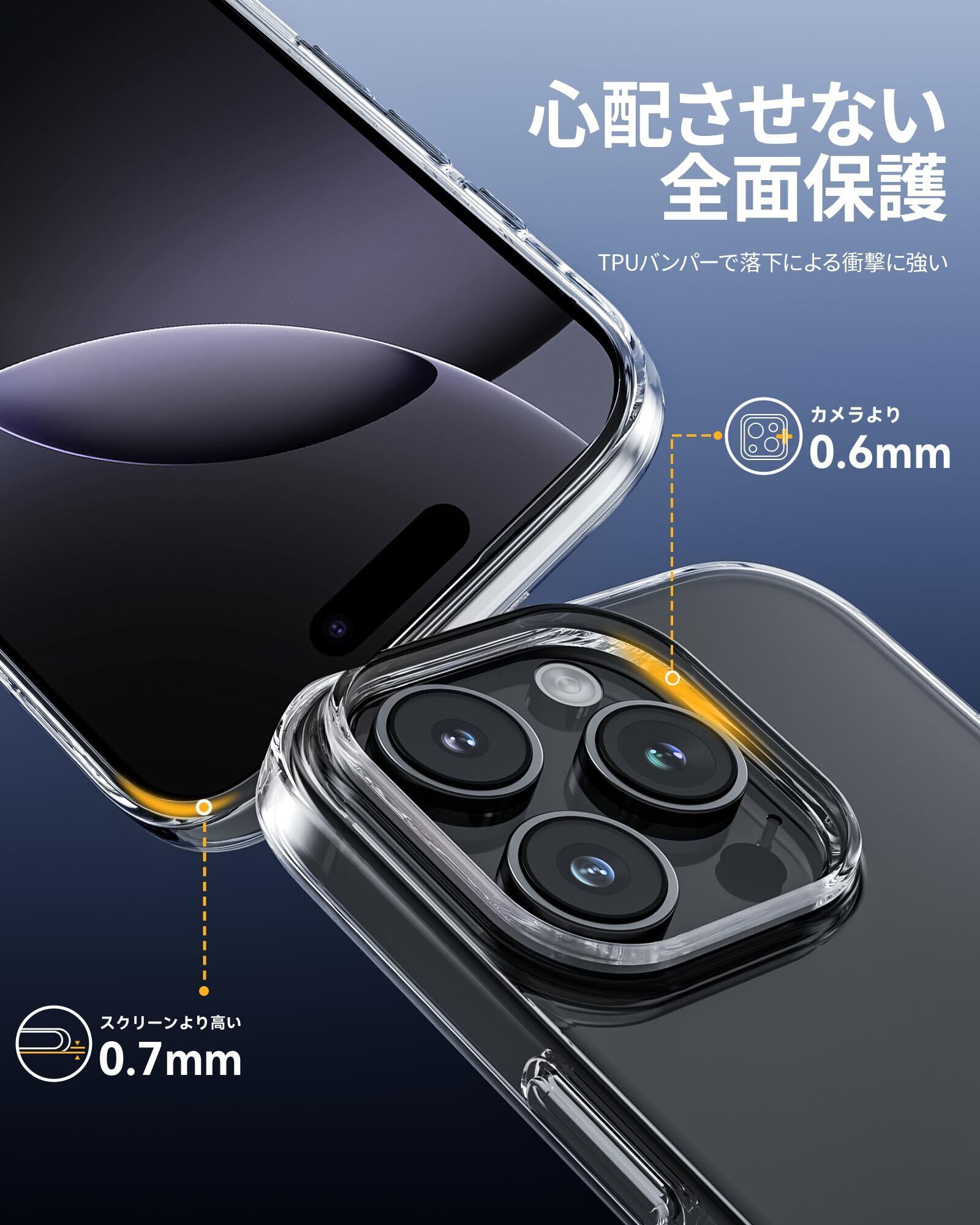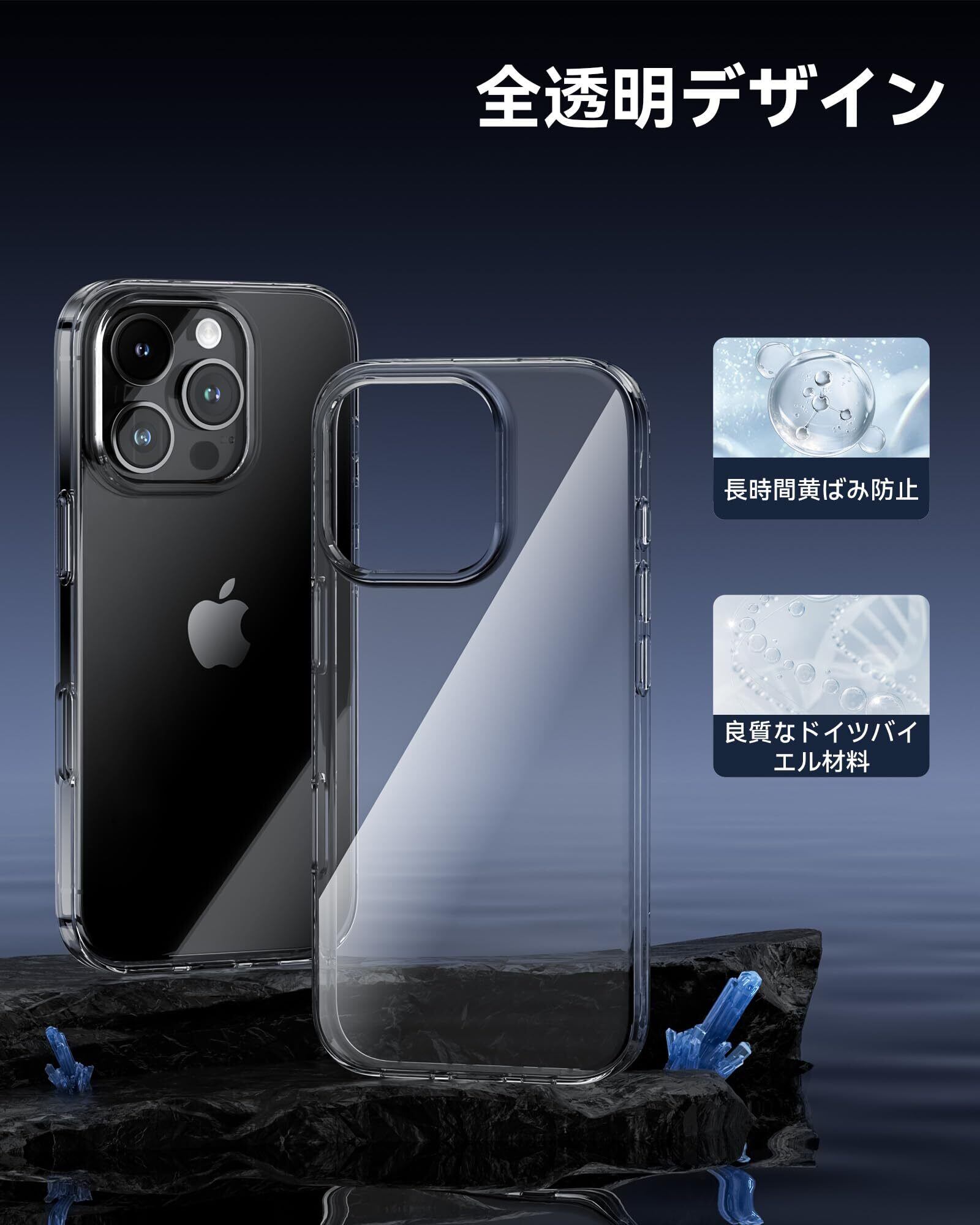 【高透明度・黄変防止】高級熱可塑性ポリウレタン(TPU)素材を採用する、従来のケースと比べてより透き通った透明感を保つことができ、長期間経ってもケースが黄変しにくく、 iPhone16ProMax本来の美しさを楽しめます。