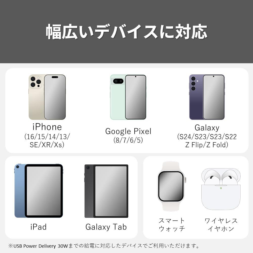 【対応機器】各種タブレット/スマートフォン/スマートウォッチ/イヤホンなど ■Type-Cポート:USB PD3.0(USB Power Delivery 3.0)の充電に対応した機器 ■Type-Aポート:最大30Wの充電に対応した機器