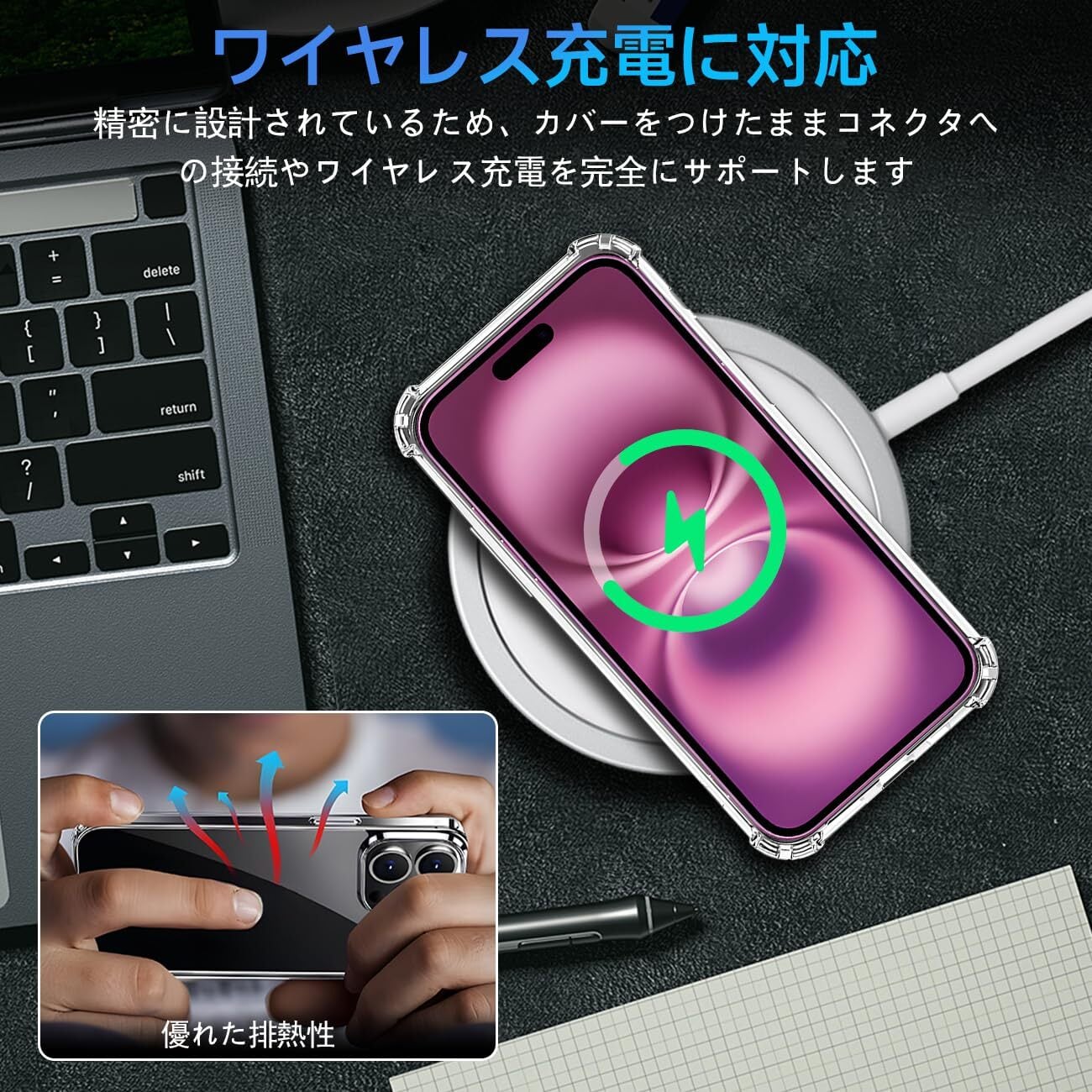 【細かいところまで保護できる安心設計・レンズと液晶画面にも保護】携帯電話を平らな面に置いたとき、液晶画面とカメラレンズの接触による不具合を最小限に抑えるため、カメラレンズより0.5mmをアップし、液晶画面より0.8mmアップしております。スクリーンを保護する同時に、ガラスフィルムをまったく邪魔しません。更に滑り止めと落下防止の設計があり、テーブルから滑り落ちる心配はありません。裏面は放熱性に優れたポリカーボネート素材を採用し、効率的に放熱し、バッテリーを完璧に保護することができます。携帯電話ケースを付けたままでもワイヤレス充電が可能です。