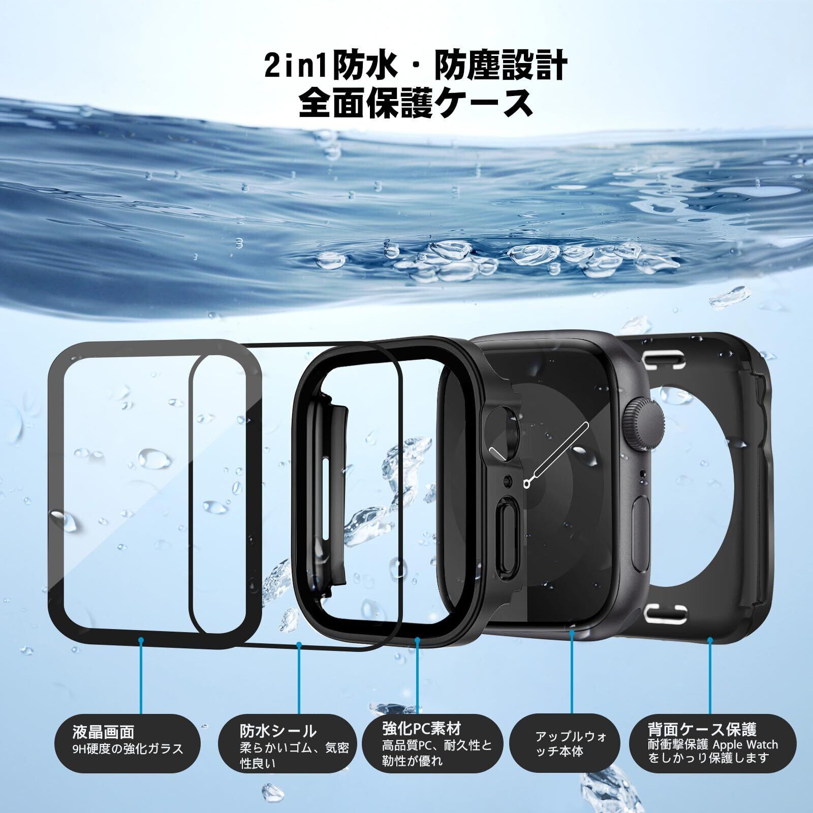 【防水・防塵ケース】シーリングリング内蔵したアッApple Watch ケース、アップルウォッチの画面にぴったりとフィットし、アップルウォッチ前面カバーと背面カバーの2 in 1全周保護設計で,表面から裏面まで 360度の全面保護します、IP67防水、防塵設計。ケースを取り外して水を拭くすることを繰り返す必要はありません。疎水性撥油性抜群の強化ガラス表面により、カバー面に水が溜まらず、シャワー、手洗い、発汗、運動、雨など、日常の使用に適しています。 ※ご注意:ウォッチの画面とカバーの間に水が浸入する場合、保護カバーを取り外し、柔らかい布で水を乾かしてください。