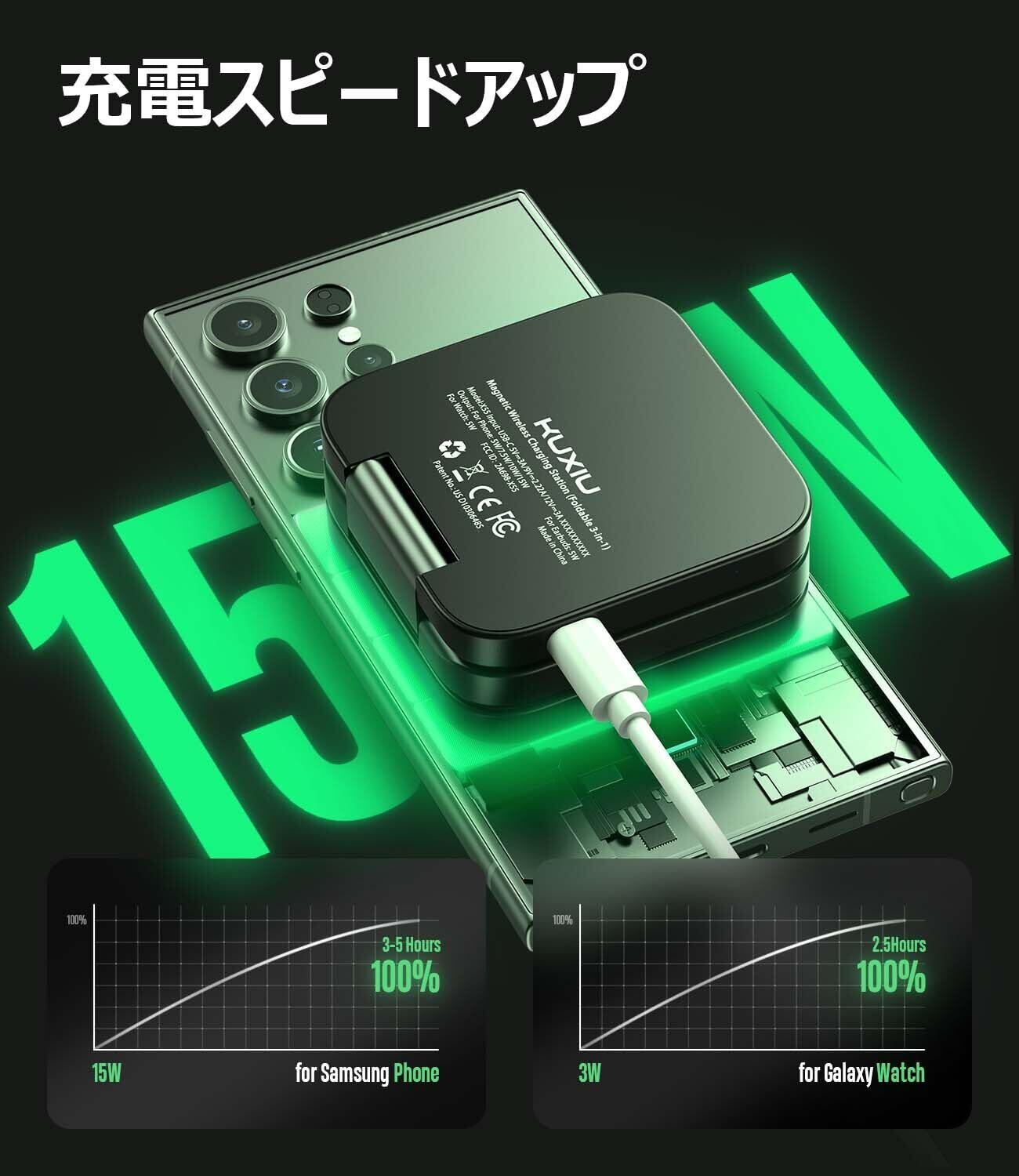 KUXIU Galaxy Watch対応 ワイヤレス充電器 3in1 置くだけ充電・折りたたみ式・3台同時充電可能 充電スタンド Galaxy S24 Ultra S23 S22 Note 20 Z Fold Flip 6 5/Galaxy Watch Ultra 7 6 5/Galaxy Buds対応 ブラック