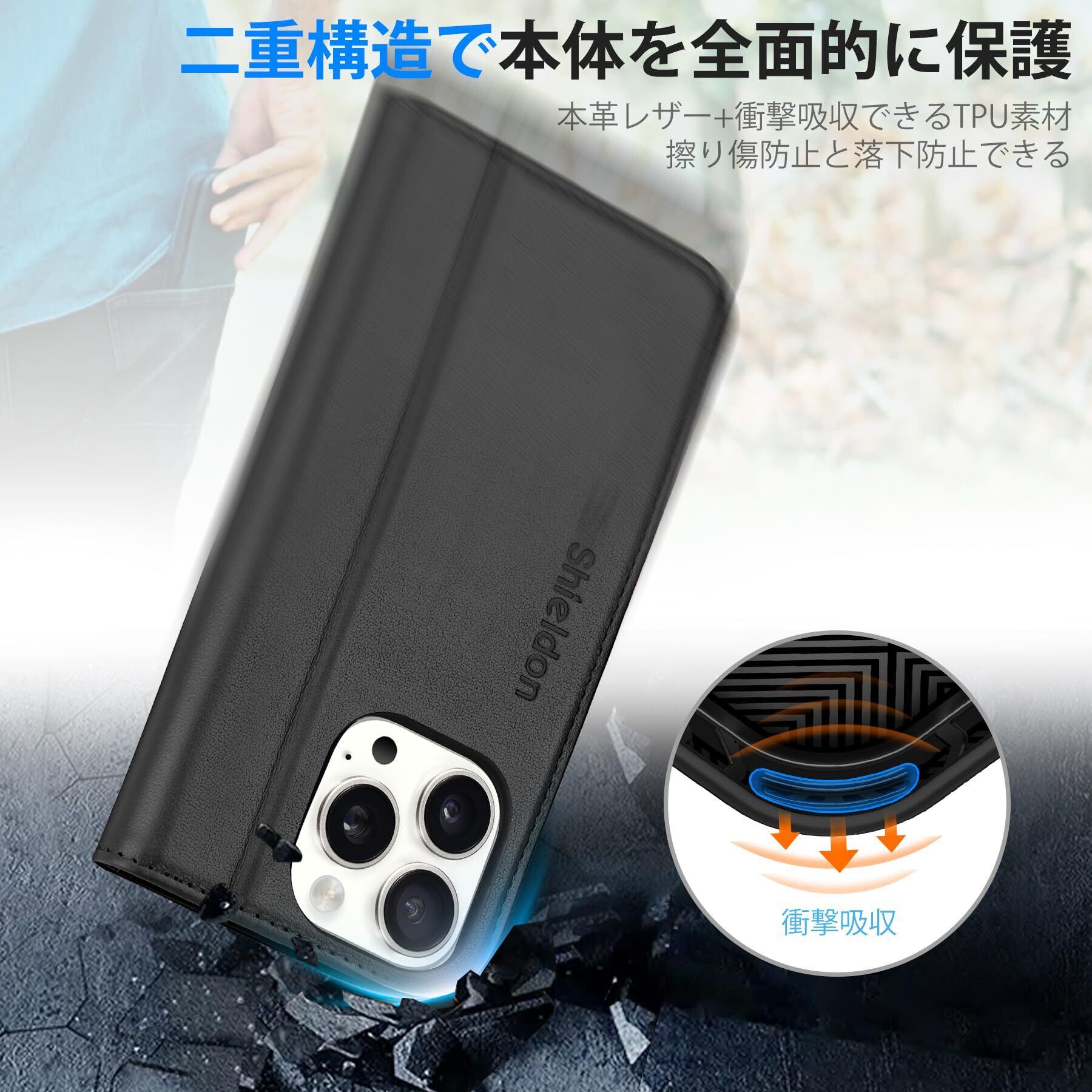 SHIELDON iPhone 16Pro 対応ケース 手帳型 本革 あいふぉん 16 プロ スマホカバー カード収納 横置きスタンド機能 マグネット内蔵 TPU素材 衝撃吸収 [RFIDブロッキング] 全面保護 アイホン 16 プロ 対応 スマホケース 2024年発売 6.3インチ 5G ブラック