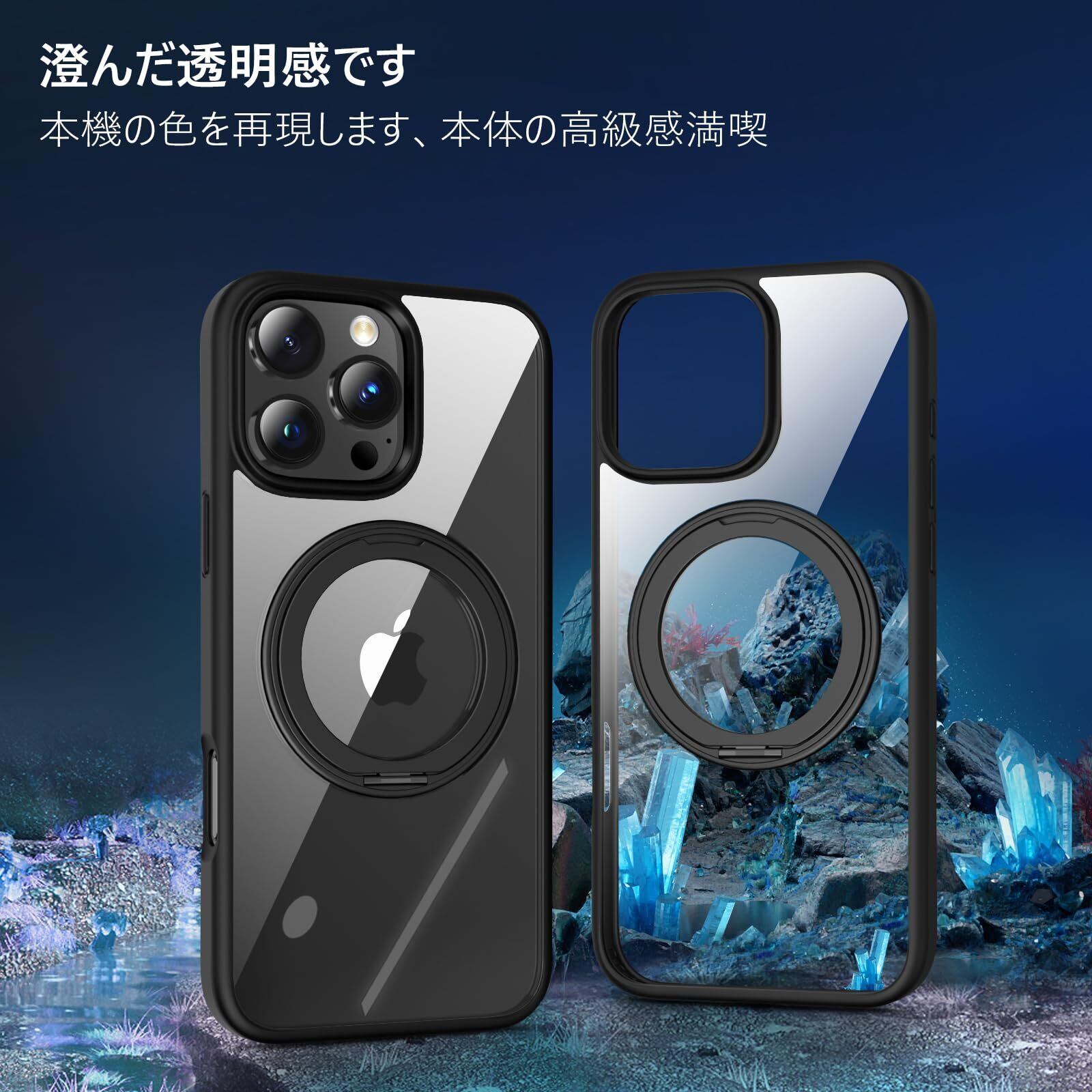 【360度回転スタンド・縦横両対応】KATSUTOYO いphone16promax 用 ケース 黄ばみにくい iphone16promax 用 ケース 強磁力リング マグネット搭載 360°回転スタンド 縦横両対応 MagSafe対応 高耐久性 米軍MIL規格 耐衝撃 指紋防止 アイホン16pro max 用 ケース(6.9インチ)背殻クリア ブラック