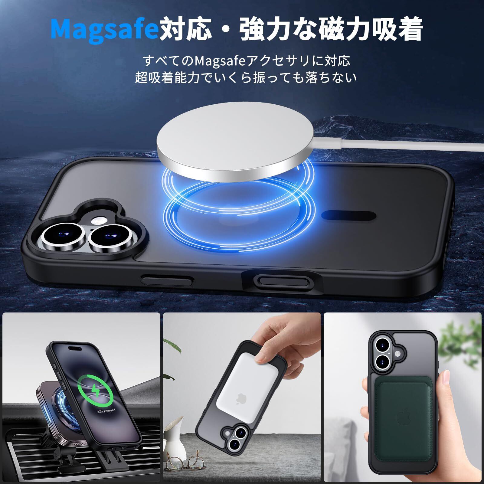 Aunote iPhone16 ケース MagSafe に対応 あいふおん16ケース マグネット 耐衝撃 レンズ保護 耐久性 黄ばみなし 指紋防止 ワイヤレス充電対応 アイフォン16 ケース 6.1 インチ 半透明 ブラック