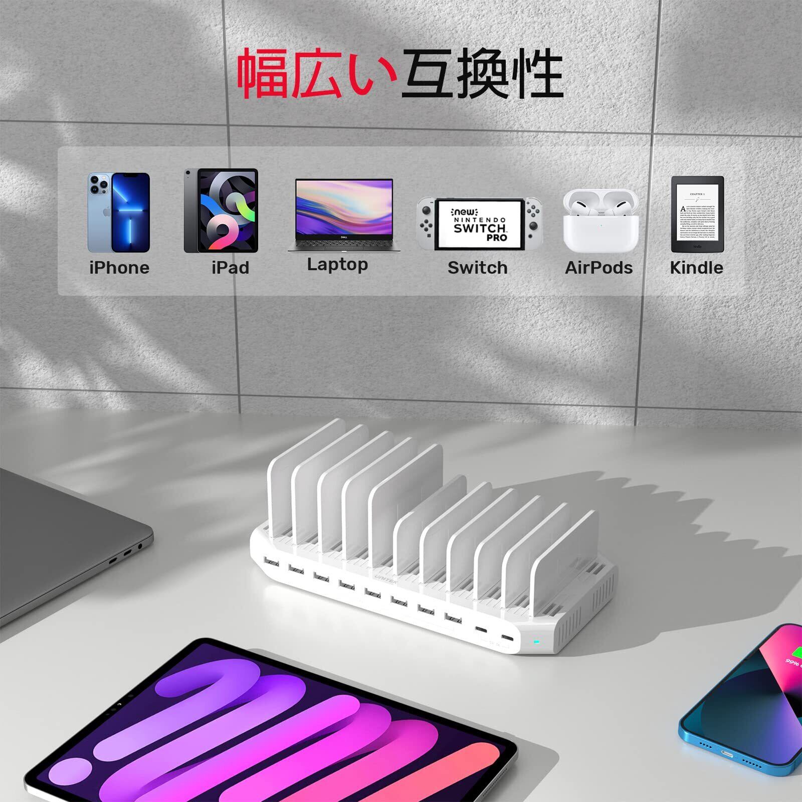 Unitek 2023 USB充電ステーション 10ポート USB C 卓上充電スタンド 120W PSE認証済 10台同時充電 1.5A/2.4A/3A スマートIC搭載 複数台対応 Android/iPhone/iPad/kindle/タブレット/PSP 仕切り板 間隔調整可能 収納便利 卓上 ホワイト