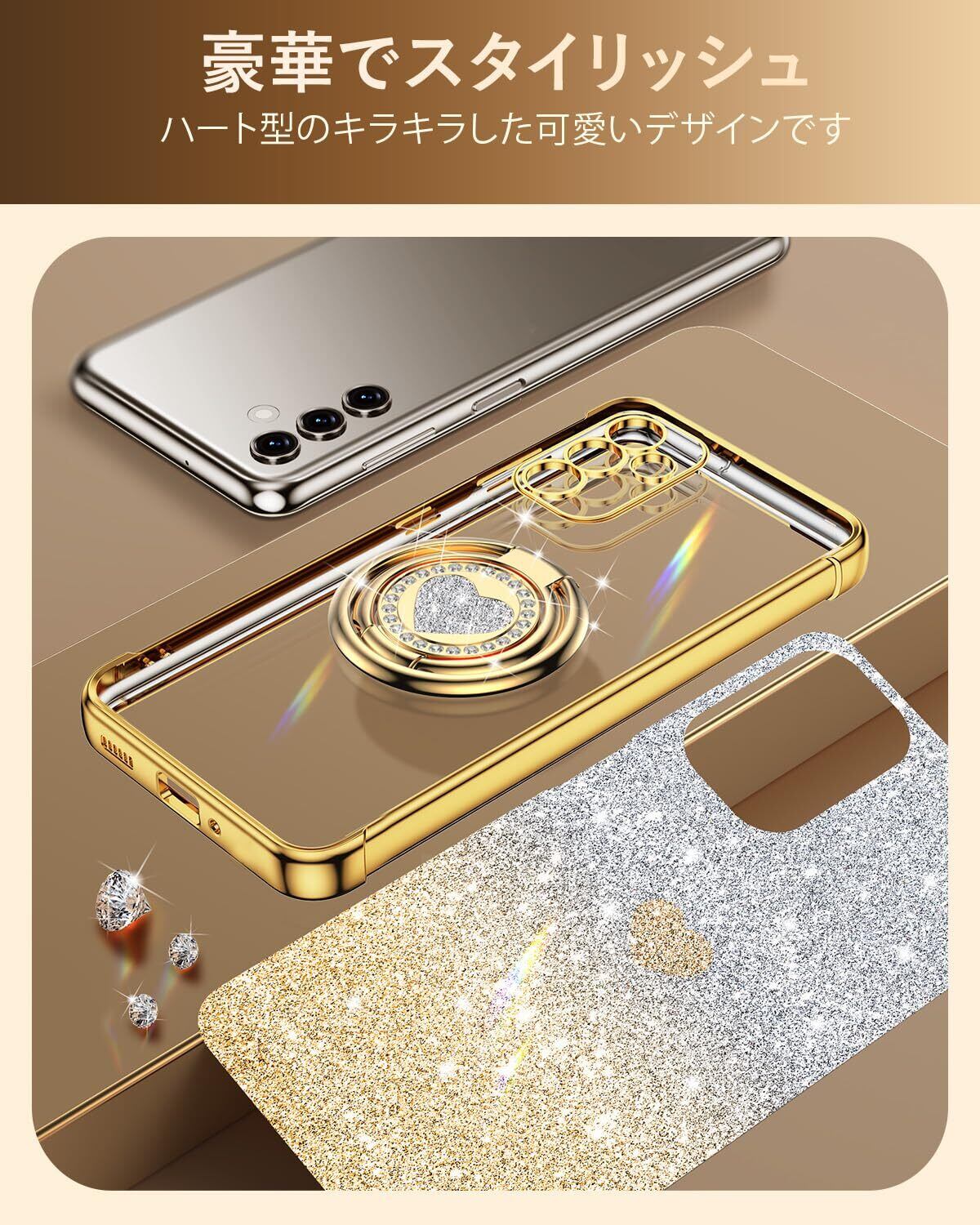 Rockaway Galaxy S25 用 ケース ダブルリング付き リストバンド ブレスレット付き ストラップ 耐衝撃 薄型 軽量 紐付き キラキラ ラブハート かわいい 女の子 おしゃれ 豪華 スマホケース ギャラクシー S25 カバー - ゴールド