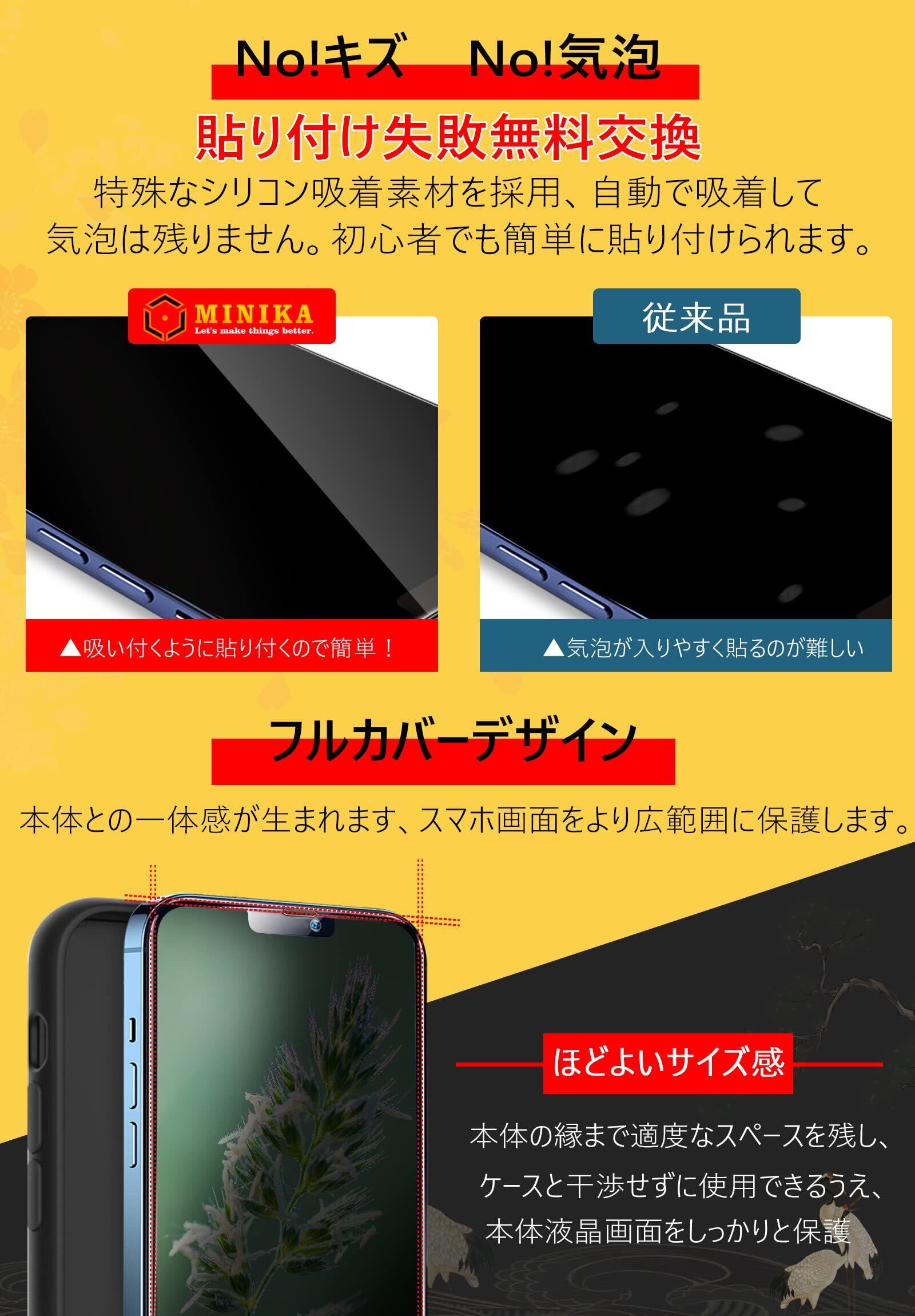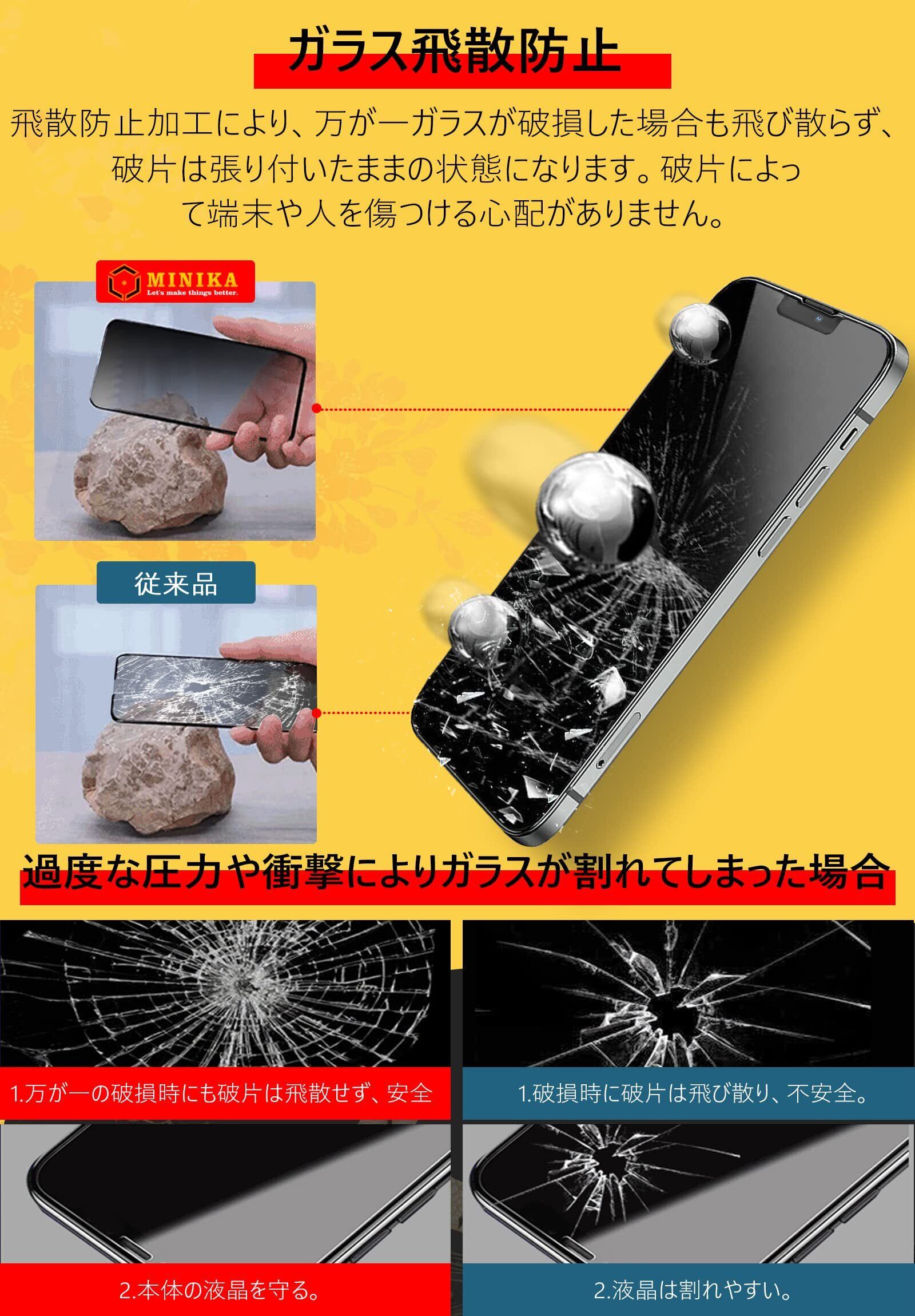 【指紋防止・飛散防止】 MINIKAのiPhone13ミニ のぞき見防止フィルム 撥油コーティング加工されているため、ホコリや指紋など汚れにくくなっています。付着しても簡単に拭き取れます。画面を美しいままに保つ、スムーズな操作が可能です。ガラスフィルムは飛散防止加工されておりますので、万が一割れの場合でも、飛び散らず張り付いた安全の状態になります。