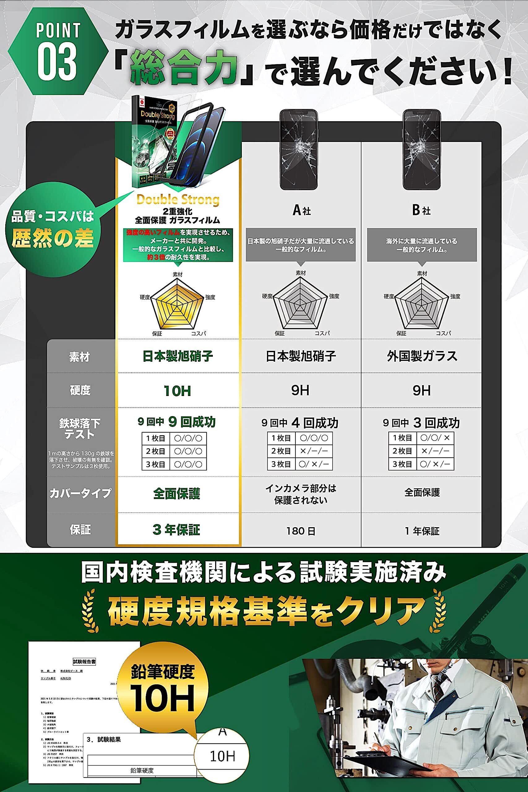 【 トップクラスの 硬度 10H の 液晶 保護 ガラスフィルム 】 一般的なフィルムの 約3倍の強度 を実現 TEIQ はより強度の高いフィルムの実現に向け製造工場と協力し開発いたしました。ガラスの内部構造を変化させる硬化処理を行うことで、一般的な フィルム と比べ 約3倍の強化 を実現しました。