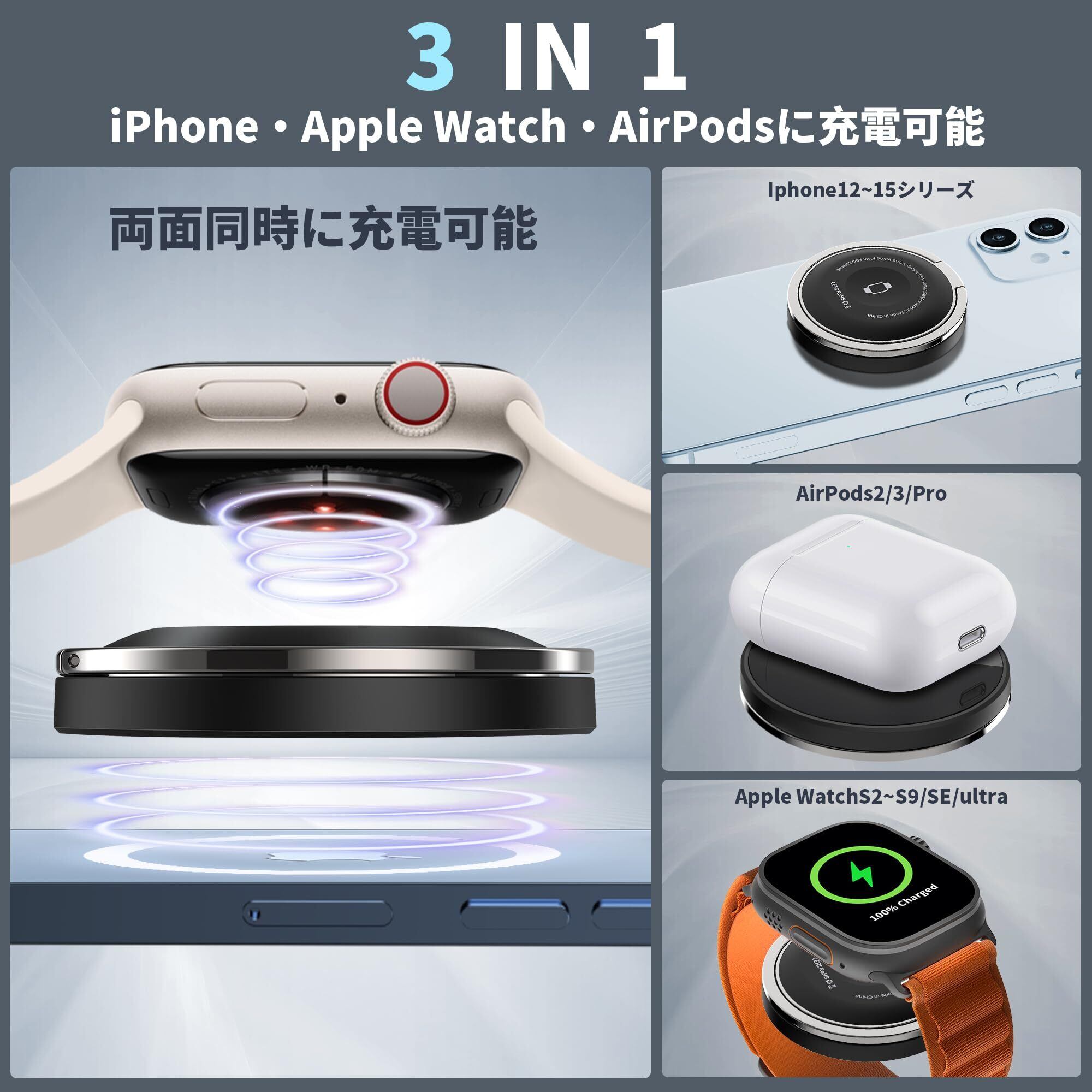 【両面同時充電・マグネット式充電・コンパクト】3in1 充電器の両面を充電でき、iPhoneとapple watchを同時に充電できます。qi 充電器はマグネット式充電、iphone/Apple Watch/AirPodssを充電器に置くだけ充電できます。超軽量、コンパクトで携帯便利です。