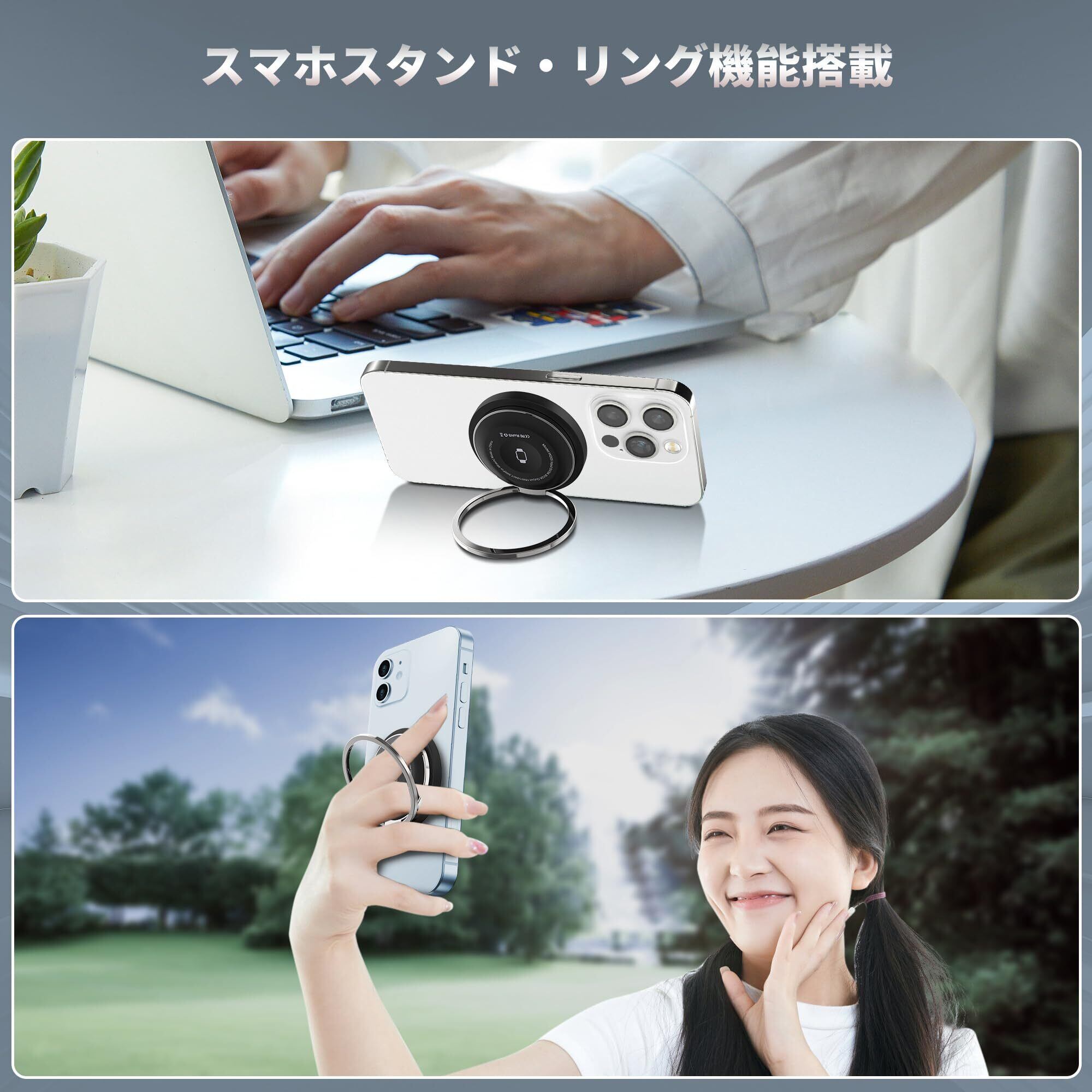 【スマホスタンド・リング機能搭載】充電器 3in1は充電機能の以外、背部にリングが付きますので、スマホリングとスマホスタンドとしても使えます。スマホリングは落下防止に役立つだけではなく、スマホを立てかけるためのスタンドの役割も果たしてくれます。リング部分は180度まで倒れるので、角度を自由に微調整できるので便利です。